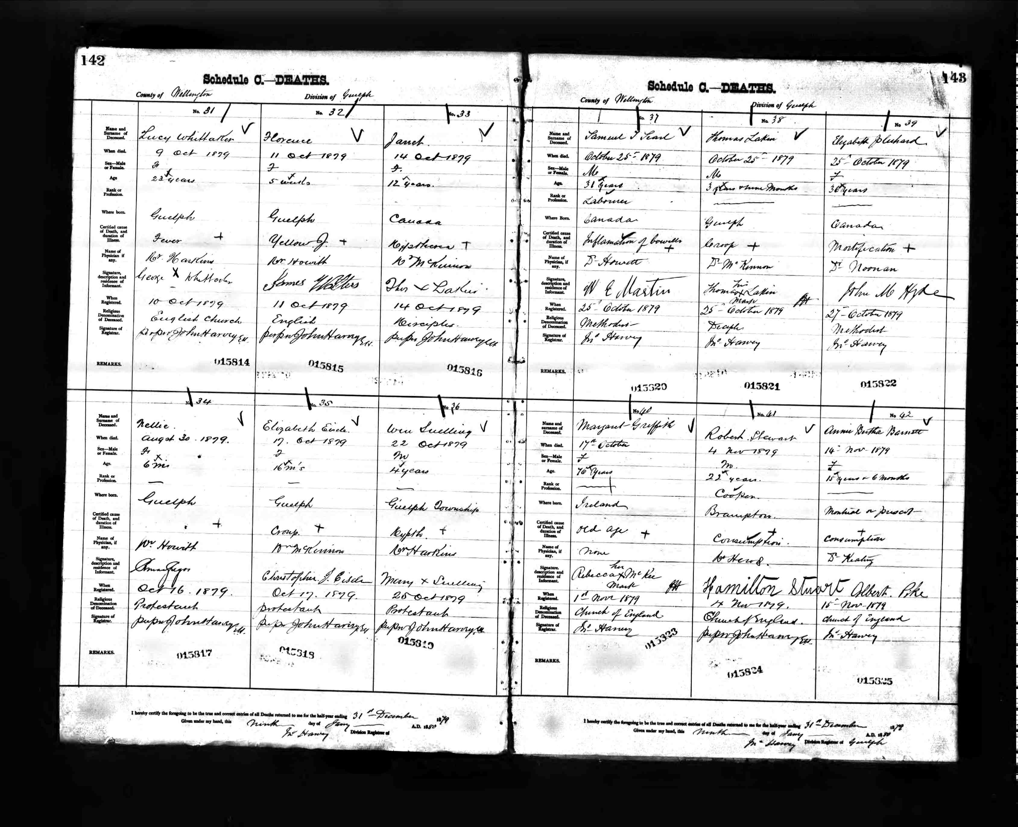 Samuel Trim Searle died October 25, 1879, in Guelph, Wellington Co., Ontario, Canada, at age 31. He was a Labourer and died from inflammation of the bowels.