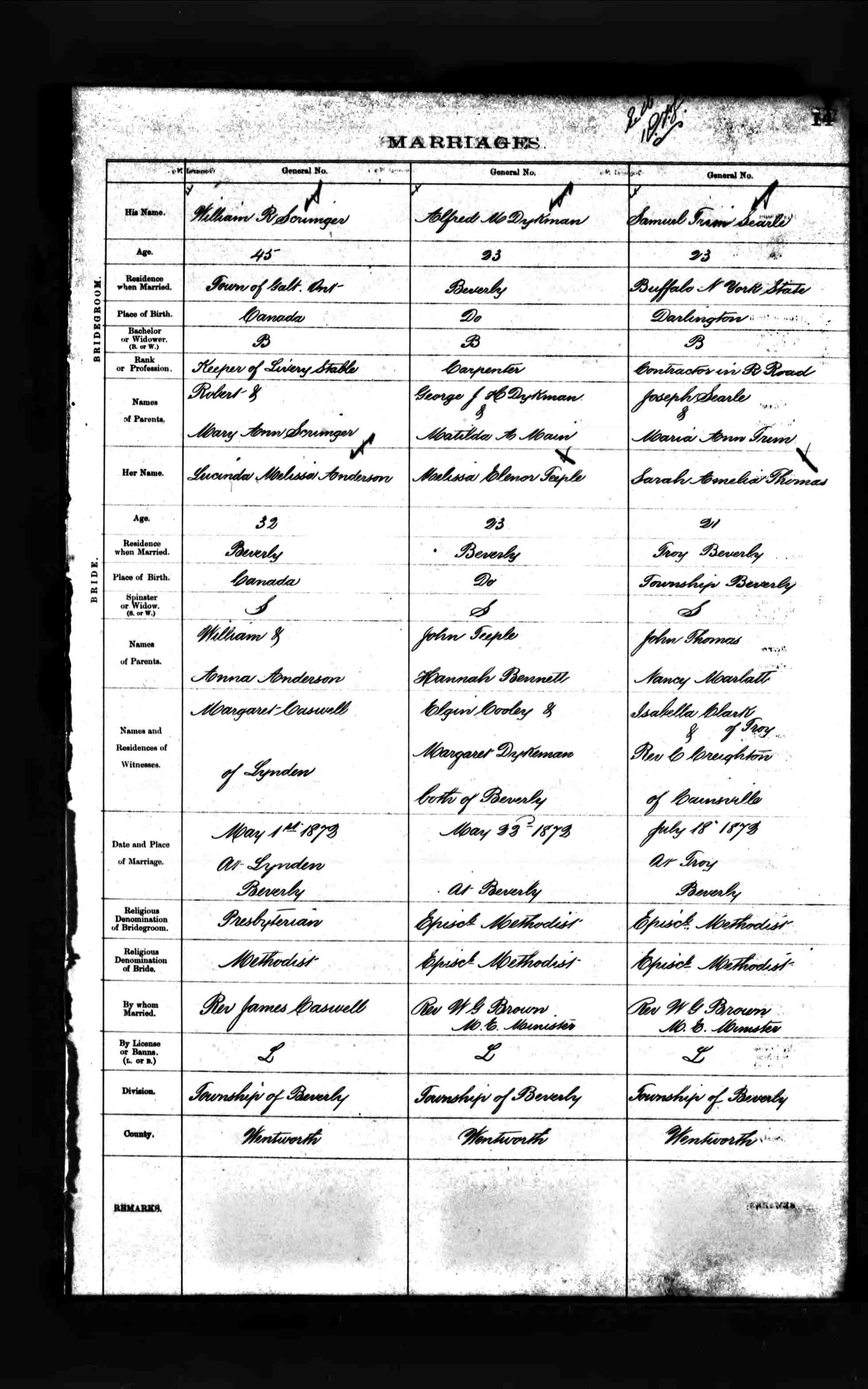 Samuel Trim Searle (a Railroad Contractor living in Buffalo, NY), and Sarah Amelia Thomas were married July 18, 1872, in Troy, Beverly Twp., Wentworth Co., Ontario, Canada .