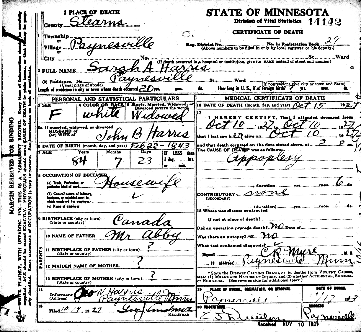 Sarah Ann (Abbey) Harris died October 15, 1927, in the City of Paynesville, Stearns Co., MN at age 83. Buried in Paynesville Cemetery, Paynesville, Stearns Co., MN.