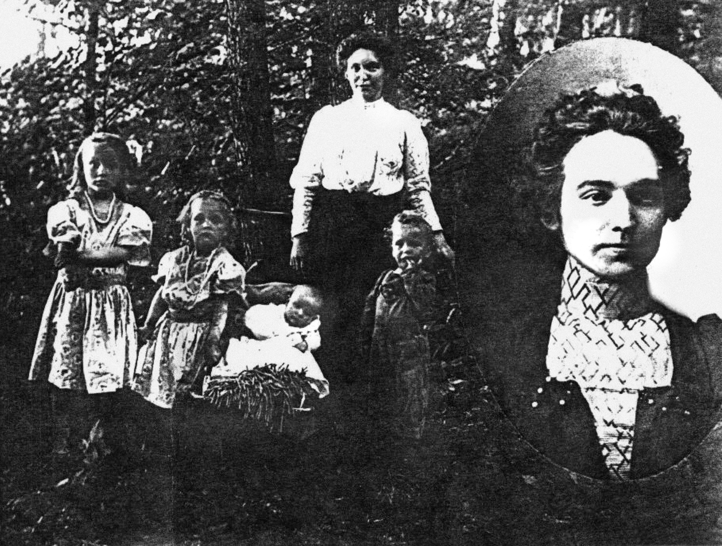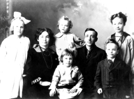 The Albert Joachim Boucher family, Marshfield, Wood Co., WI, January 2, 1916. L to R: June Juanita Boucher (age 11), Sarah Jane "Sadie" (Hollingshead) Boucher (age 33), Melton George Boucher (age 5), Myrtle Azielda Boucher (age 7), Albert Joachim Boucher (age 35), Washington Edward Boucher (age 9), and Haziel Stella Boucher (age 13). Photo courtesy of Gene Boucher.