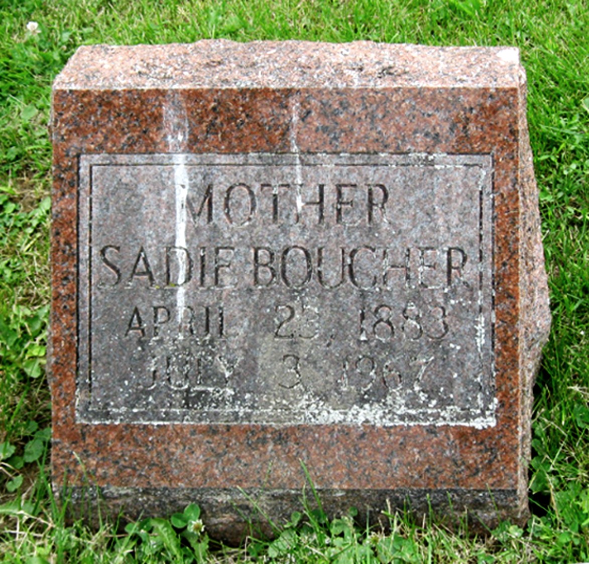 Sarah Jane "Sadie" (Hollingshead) Boucher died July 3, 1967, at Wausau Memorial Hospital, Wausau, Marathon Co., WI, at age 84. Buried in Hillside Cemetery, Marshfield, Wood Co., WI.