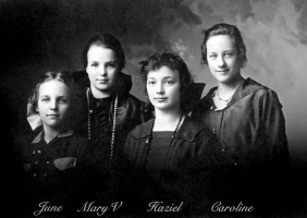 Left to Right: June Juanita Boucher, Mary V. Unknown, Haziel Stella Boucher, and Caroline Unknown, Marshfield, Wood Co., WI, about 1920.