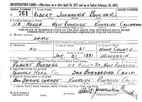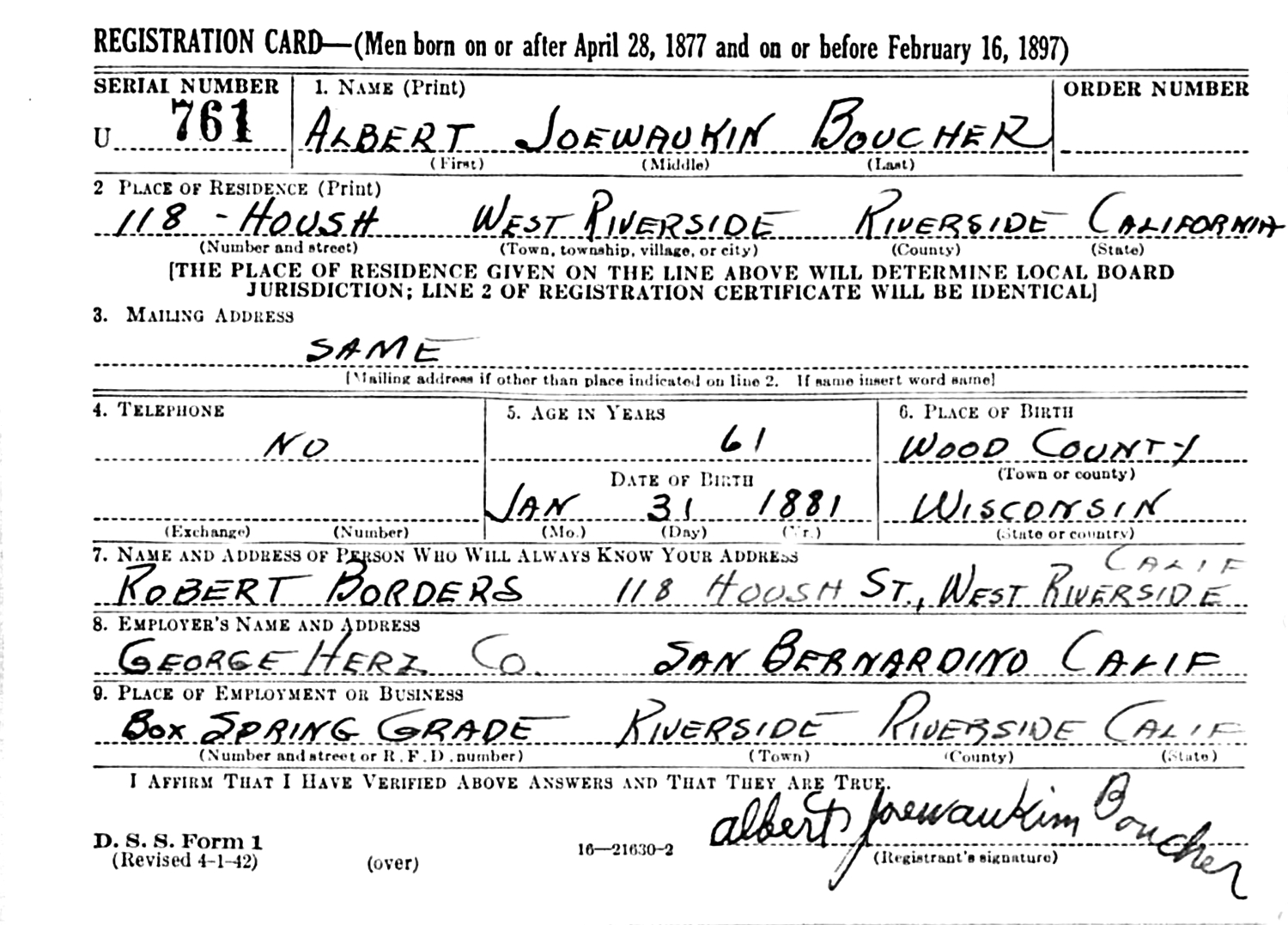 The WWII Draft Registration Report taken in 1942 shows Albert Joewaukin Boucher, age 61, born January 31, 1881, in Wood Co., WI, is living at 118 Housh St., West Riverside, Riverside Co., CA.