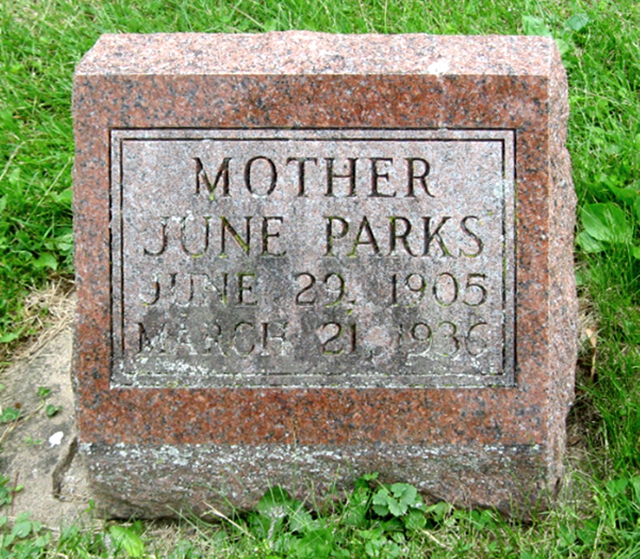 - June Juanita Boucher: Born June 28, 1905, in Minocqua, Oneida Co., WI; Died Saturday, March 21, 1936, at St. Joseph's Hospital, Marshfield, Wood Co., WI (age 30). Buried in Hillside Cemetery, Marshfield, Wood Co., WI. Married (1) Saturday, February 2, 1924, at the Presbyterian manse, Marshfield, Wood Co., WI, to Joe Deane "Joey" Stanton : Born May 31, 1907, in Greenwood, Clark Co., WI; Died June 11, 1966, in Marshfield, Wood Co., WI (age 59). Buried in Neillsville City Cemetery, Neillsville, Clark Co., WI. Divorced January 29, 1927, in Wisconsin Rapids, Wood Co., WI. Married (2) Thursday, June 20, 1929, in Marshfield, Wood Co., WI, to Lloyd Stewart Parks: Born August 19, 1903, in Wood Co., WI; Died December 28, 1979, in Athens, Marathon Co., WI (age 76).