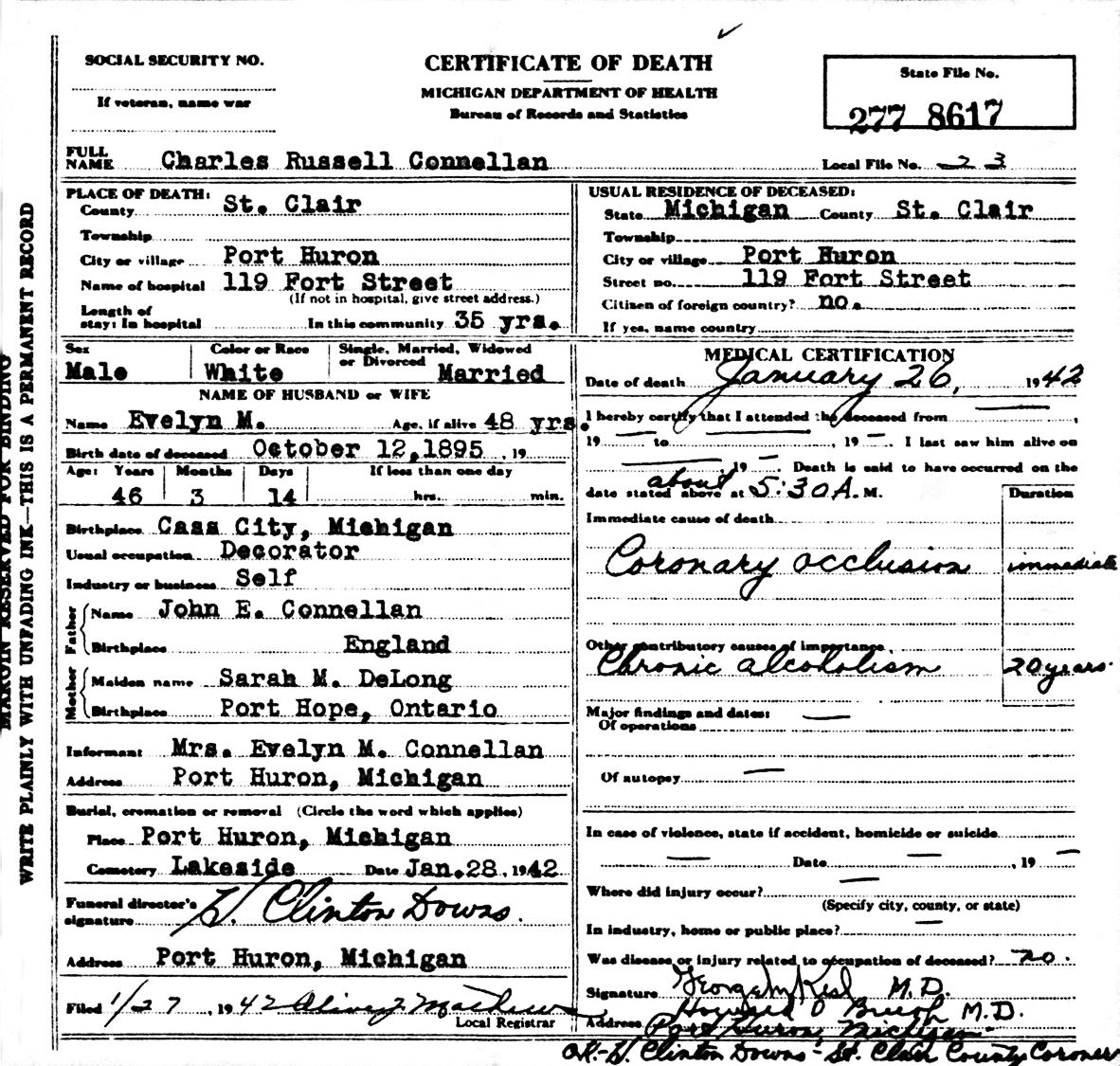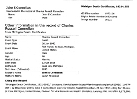 Charles Russell Connellan died January 26, 1942, in Port Huron, St. Clair Co., MI, at age 46. Buried in Lakeside Cemetery, Port Huron, St. Clair Co., MI.