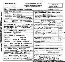 - Charles Russell Connellan: Born October 12, 1895, in Cass City, Tuscola Co., MI; Died January 26, 1942, in Port Huron, St. Clair Co., MI (age 46). Buried in Lakeside Cemetery, Port Huron, St. Clair Co., MI. Married October 22, 1911, in the Town of Sarnia, Lambton Co., Ontario, Canada, to Maud Evelyn Bland: Born July 21, 1891, in Petrolia, Lambton Co., Ontario, Canada; Died May 16, 1964, at Port Huron Hospital, Port Huron, St. Clair Co., MI (age 71). Buried in Lakeside Cemetery, Port Huron, St. Clair Co., MI. Evelyn was married to Ernest W. Spencer at the time of her death. Evelyn Connellan and Ernest Spencer were fined for disorderly conduct November, 7, 1937, in Port Huron.