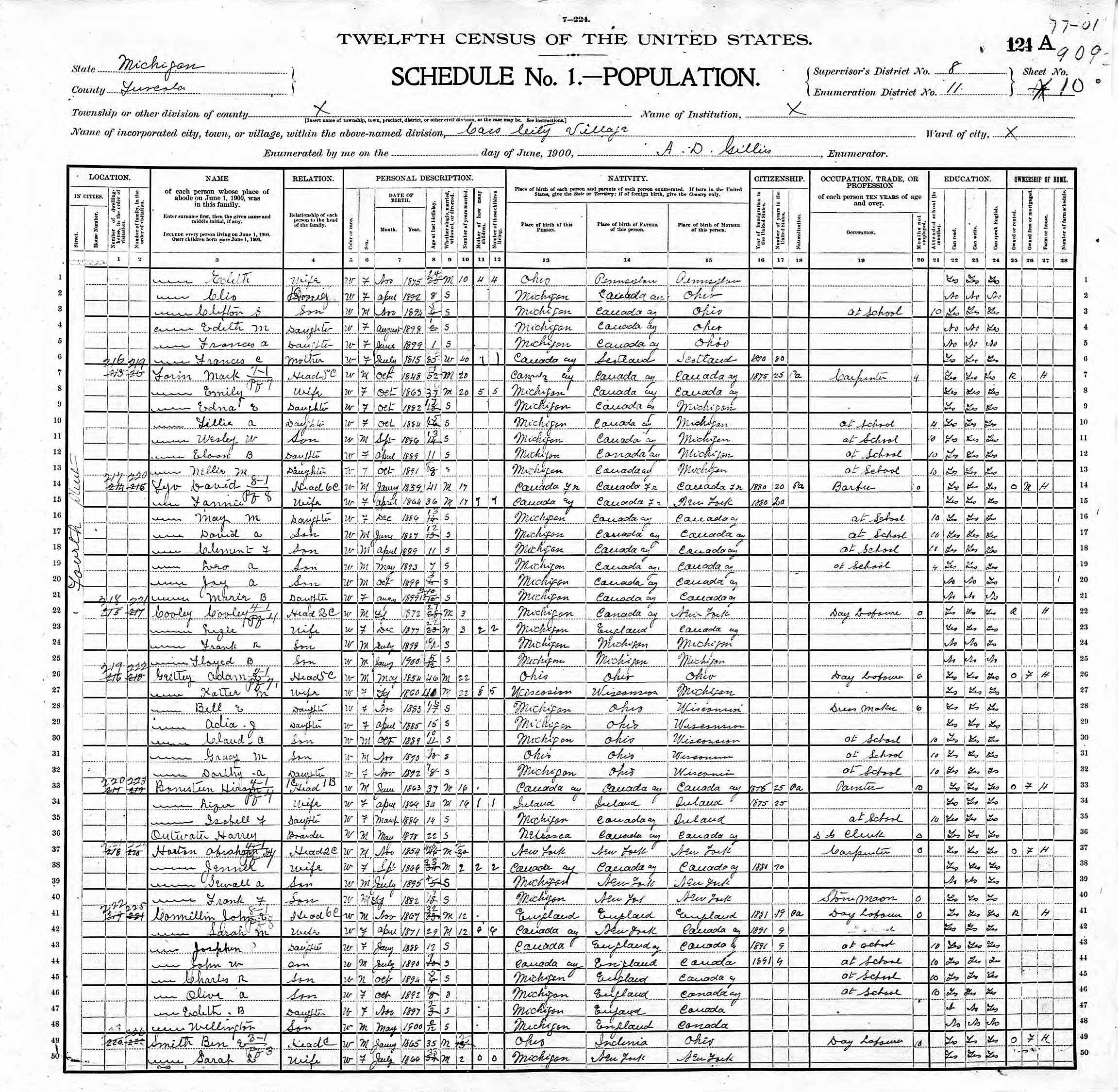 Sarah Melissa DeLong was born April 12, 1872, in Durham Co., Ontario, Canada, and died January 9, 1942, at her home, Port Huron, St. Clair Co., MI, at age 69. Buried in Lakeside Cemetery, Port Huron, St. Clair Co., MI. She is the daughter of Reuben L. DeLong of Cavan Twp., Victoria Co., Upper Canada, and Alice Searle of Hope Twp., Durham Co., Upper Canada.