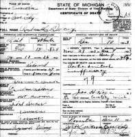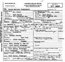 Sarah Melissa (DeLong) (Connellan) (Bailey) (Townsend) Vanderhoof died January 9, 1942, at her home, Port Huron, St. Clair Co., MI, at age 69. Buried in Lakeside Cemetery, Port Huron, St. Clair Co., MI.