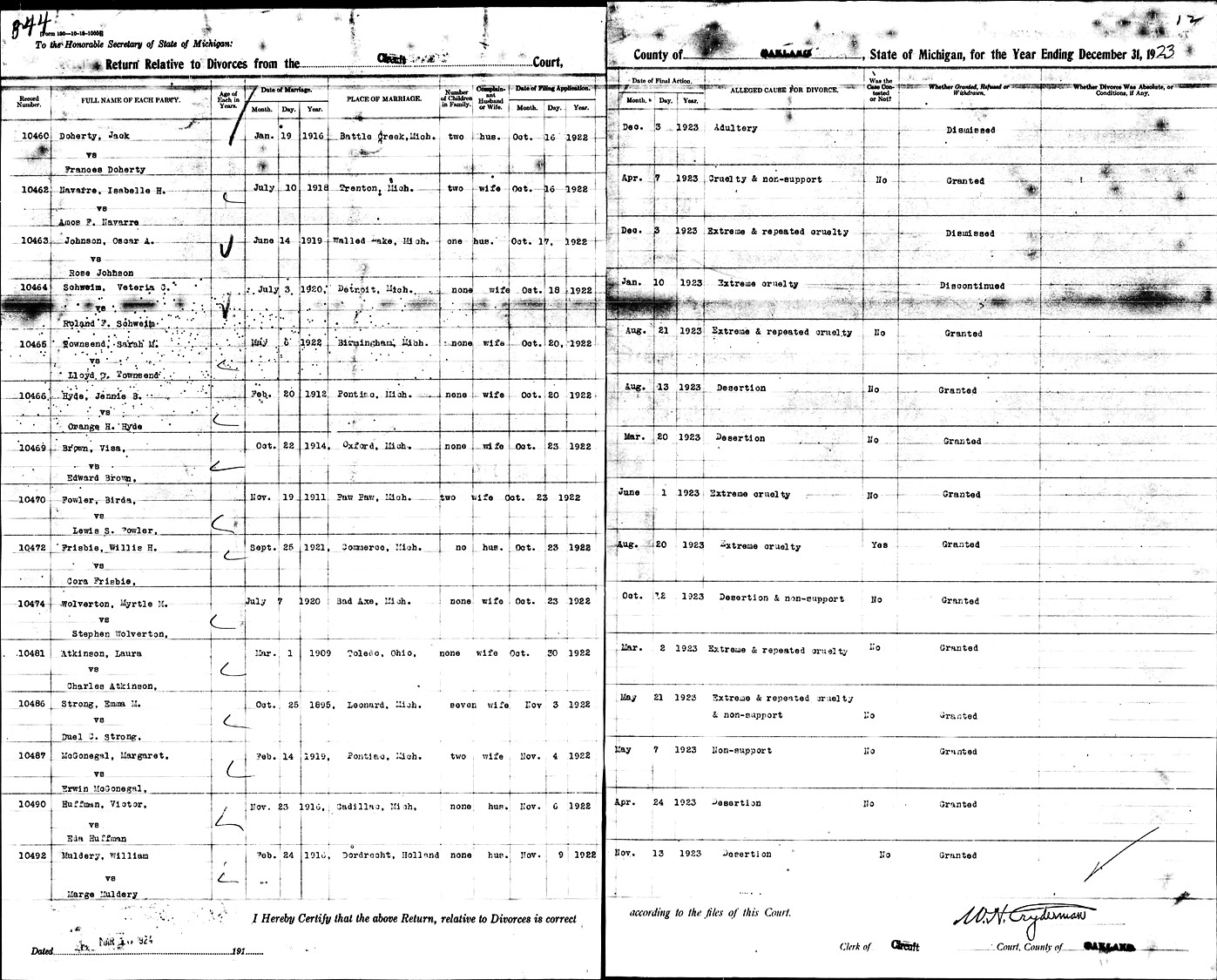 Martin A. Vanderhoof and Llewella Hannah (Messenger) Vanderhoof were divorced January 7, 1914, in Lake Co., MI. She had charged Desertion and Non-support.