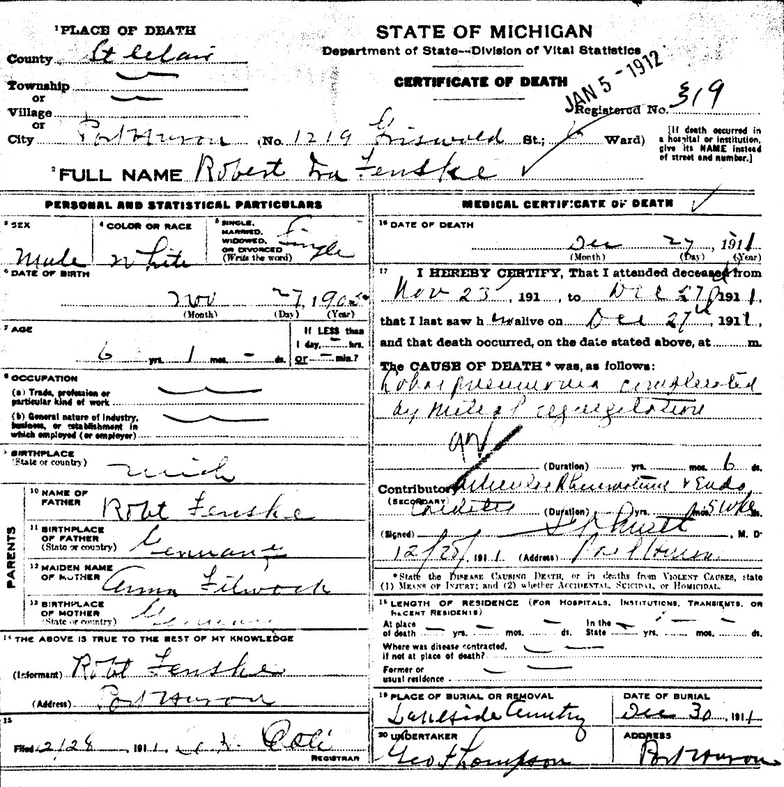 - Robert Ira Fenske: Born November 27, 1905, in Port Huron, St. Clair Co., MI; Died December 27, 1911, in Port Huron, St. Clair Co., MI (age 6). Buried in Lakeside Cemetery, Port Huron, St. Clair Co., MI.