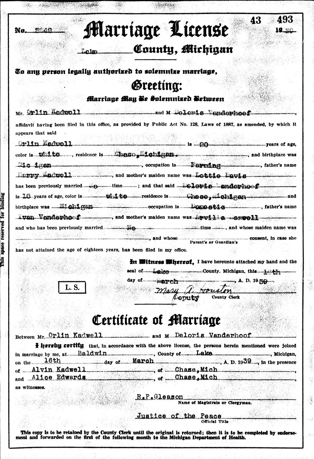 Orlin Kadwell and Doloris Vanderhoof were married March 16, 1939, at Baldwin, Chase Co., MI.
