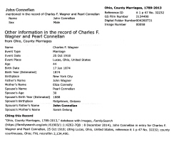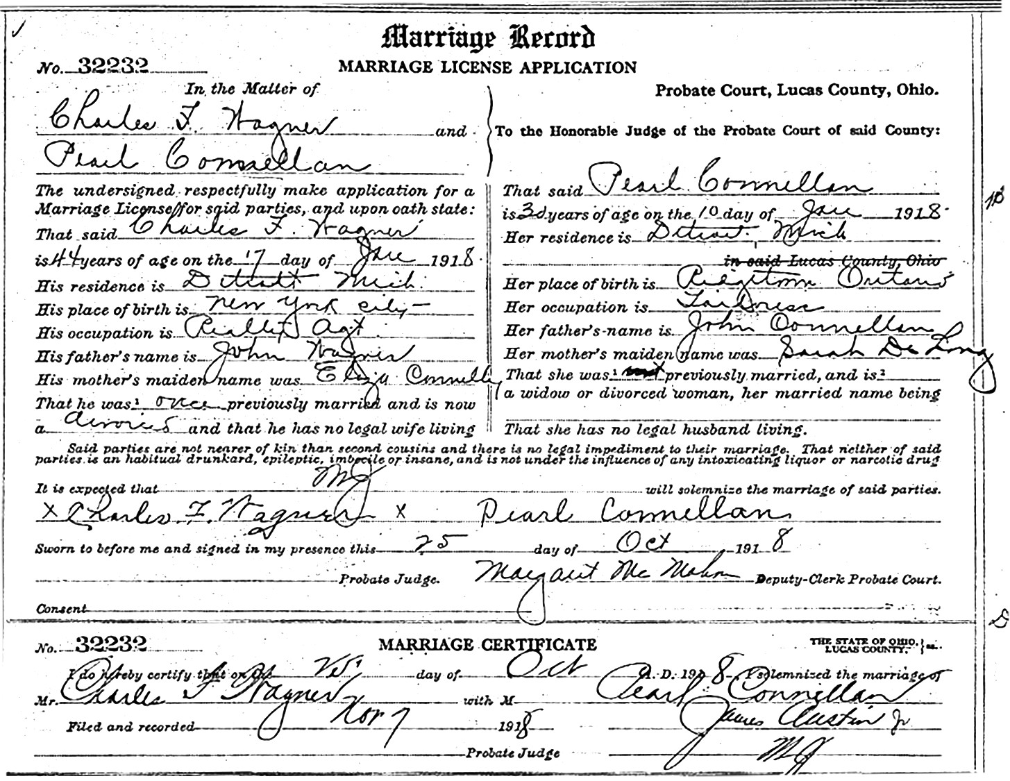 - Josephine Pearl DeLong: Born January 10, 1888, in Guilds, Harwich Division, Kent Co., Ontario, Canada; Died March 29, 1986, at Marwood Manor, Port Huron, St. Clair Co., MI (age 98). Buried in Roseland Park Cemetery, Berkley, Oakland Co., MI. Married October 25, 1918, in Lucas, OH, to Charles F. Wagner: Born January 17, 1874, in New York City, NY; Died November 26, 1934, in Detroit, Wayne Co., MI (age 60). Buried in Woodmere Cemetery, Detroit, Wayne Co., MI.