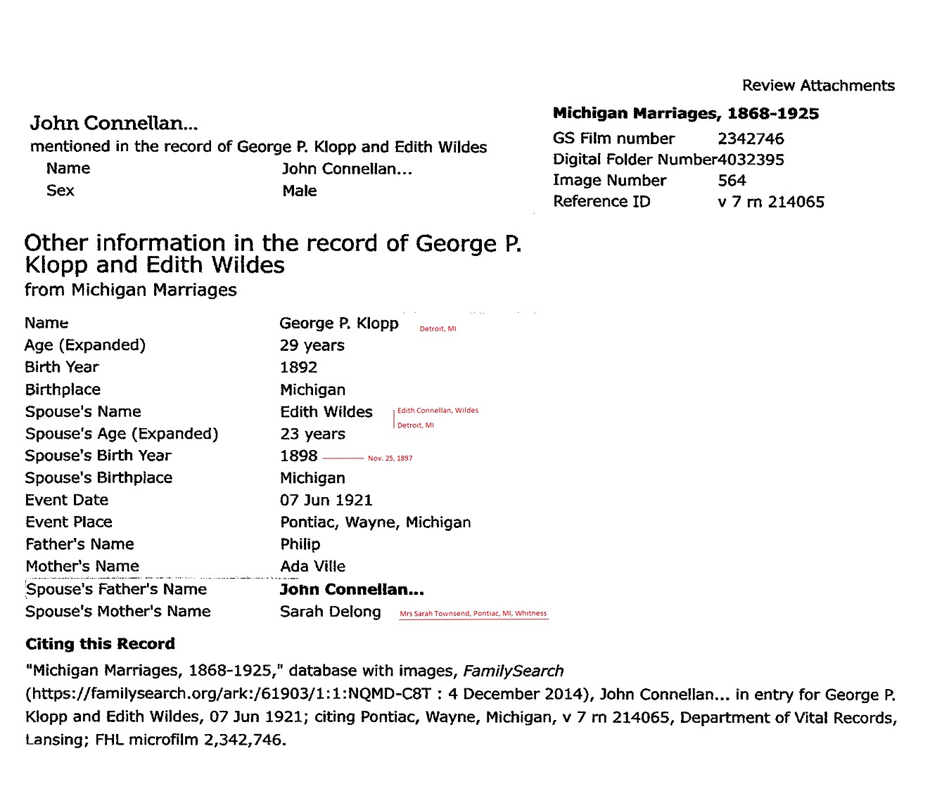 - Edith B. Connellan: Born November 5, 1897, in Cass City, Tuscola Co., MI; Died 1957 - 1984 in Unknown . Married (1) Unknown, to William F. Wilds: Born 1893, in Michigan; Died May 4, 1962, in Michigan (about age 69). Buried in Lakeview Cemetery, Clarkston, Oakland Co., MI. Divorced about 1920 in Michigan. Married (2) June 7, 1921, in Pontiac, Wayne Co., MI, to George P. Klopp: Born March 26, 1892, in Michigan; Died December 14, 1952, in Mecosta Co., MI (age 60). Buried in Carleton Cemetery, Carleton, Monroe Co., MI. Divorced July 29, 1927, in Wayne Co., MI. He had charged her with Extreme Cruelty. Married (3) June 23, 1928, in Detroit, Wayne Co., MI, to Oscar Joseph Callens: Born January 30, 1895, in Courtrai, W. Flanders, Gulleghem, Belgium; Died December 12, 1958, in Detroit, Wayne Co., MI (age 63). Divorced September 25, 1946, in Wayne Co., MI.