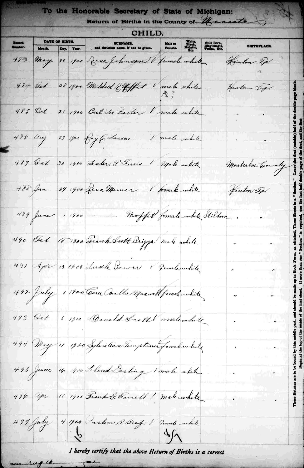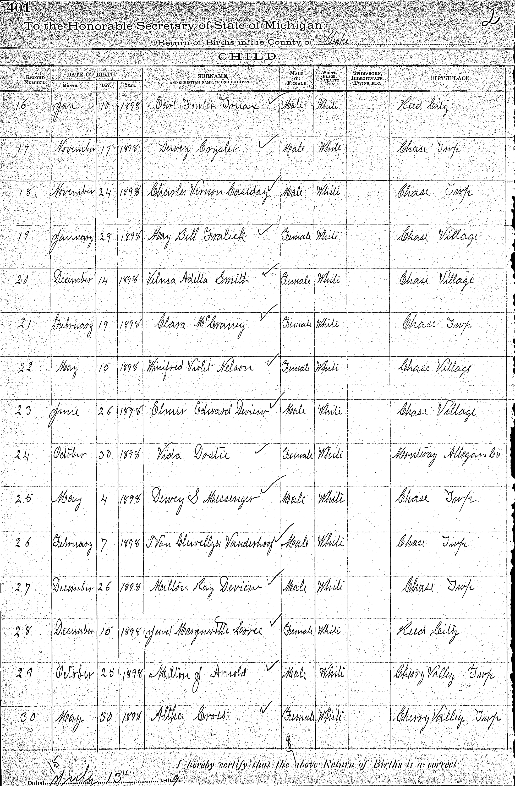 Martin A. Vanderhoof and Llewella Hannah Messenger were married July 15, 1895, in the Village of Chase, Lake Co., MI.