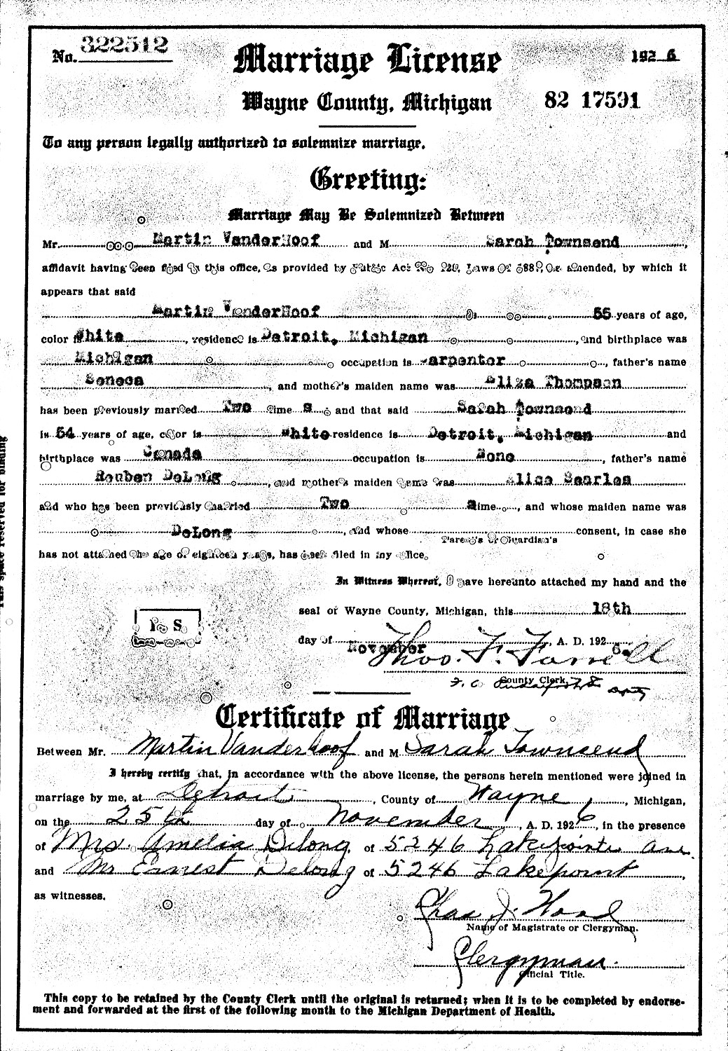 Martin A. Vanderhoof and Sarah Melissa (DeLong) (Connellan) (Bailey) Townsend were married November 25, 1926, in Detroit, Wayne Co., MI.