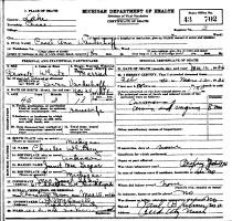 - Ivan Llewellyn Vanderhoof: Born February 7, 1898, in Chase Twp., Lake Co., MI; Died September 18, 1984, at Oak Village Care Center, Baldwin, Lake Co., MI (age 86). Buried in Chase Township Cemetery, Chase, Lake Co., MI. Married (1) September 18, 1918, in Baldwin, Lake Co., MI, to Arvilla Cora Maxwell: Born July 1, 1900, in Hinton Twp., Mecosta Co., MI; Died July 13, 1975, in Grand Rapids, Kent Co., MI (age 75). Buried in Chase Township Cemetery, Chase, Lake Co., MI. Divorced. Married (2) April 4, 1934, in Elkhart, Elkhart Co., IN, to Pearl Anna (Whitney) Wilson: Born November 24, 1890, in Muskegon, Muskegon Co., MI; Died March 12, 1936, in Chase Twp., Lake Co., MI (age 45). Buried in Chase Township Cemetery, Chase, Lake Co., MI. Arvilla then married October 20, 1934, in Chase Twp., Lake Co., MI, to Rowland R. Hills: Born December 9, 1904, in Michigan; Died June 8, 1964, in Michigan (age 59). Buried in Chase Township Cemetery, Chase, Lake Co., MI.