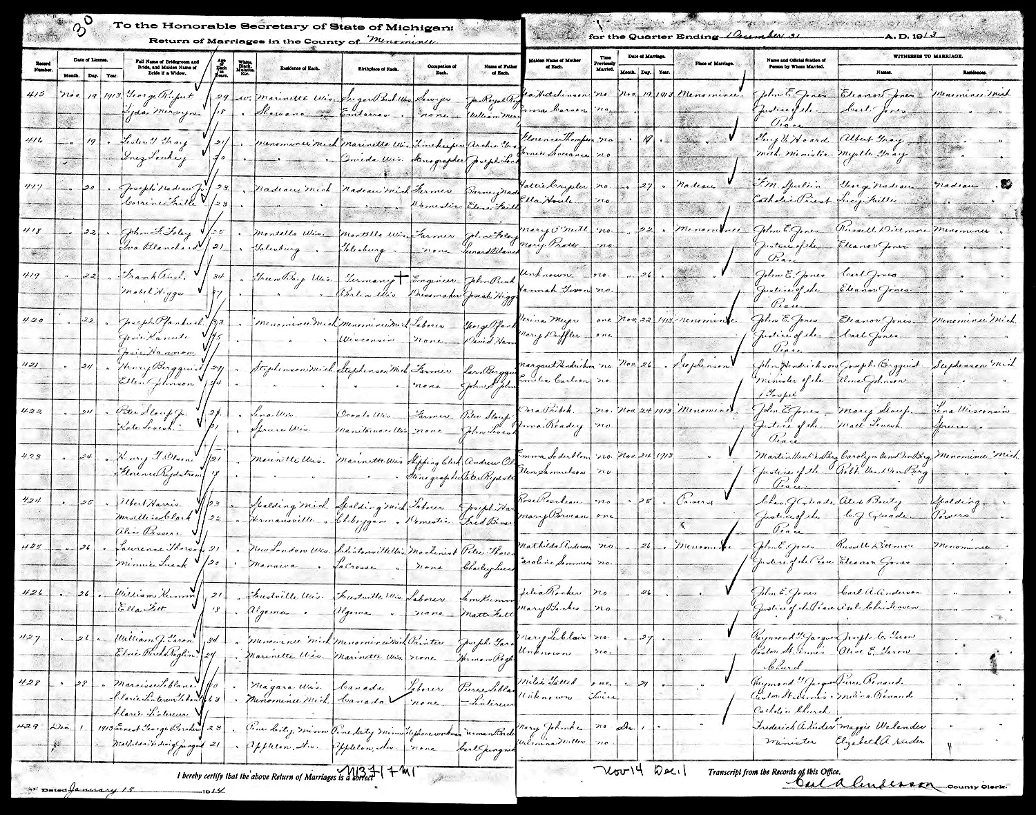 Ernest George Borchers and Mathilda Hedwig Jungnik were married (1) December 1, 1913, in Menominee, Menominee Co., MI.