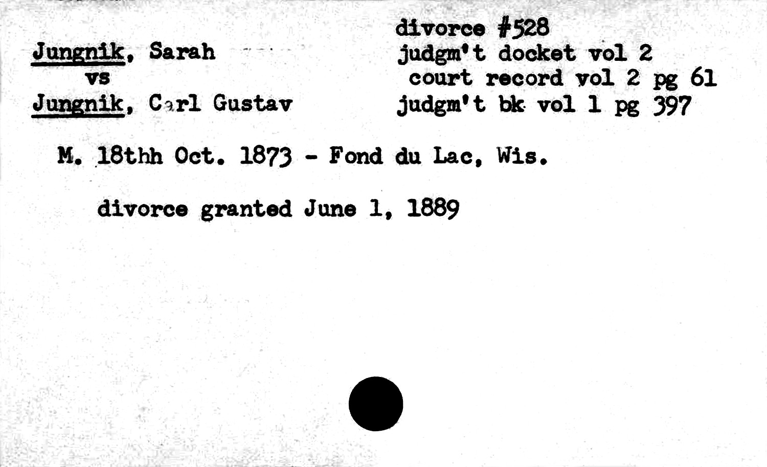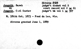 Carl Gustav "Charles" Jungnik and Sarah "Sadie" (Kuntz) Jungnik were divorced June 1, 1889, in Fond du Lac Co., WI.
