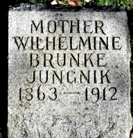 Wilhelmina "Minnie" (Mueller) (Brunke) Jungnik died December 20, 1911, in Appleton, Outagamie Co., WI , at age 49. Buried in Riverside Cemetery, Appleton, Outagamie Co., WI.