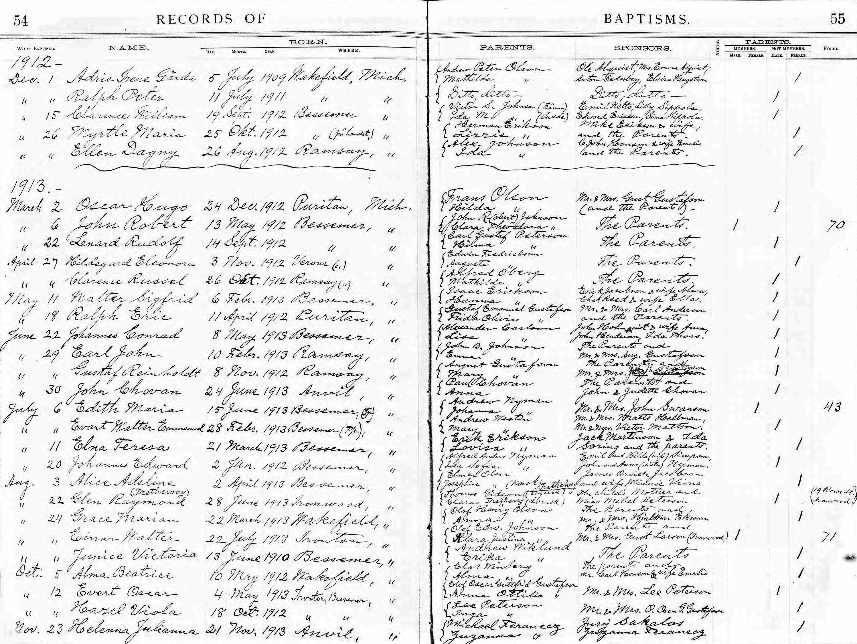 Junice Victoria "June" Wicklund was born June 13, 1910, in Bessemer, Gogebic Co., MI, and was Baptized August 24, 1913, at Sharon Lutheran Church, Bessemer, Gogebic Co., MI.