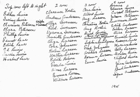 Third row from top: Cora (Wagner) Lewis - wife of Albert Lewis , Albert Lewis - son of Gustaf Larsson Lewis , Per August Magnusson Larson, son of Magnus Larsson , Christine (Andersdotter) Norlin - wife of August Norlin , August Norlin - husband of Christine Andersdotter , Gustaf Larsson Lewis , Charles Oscar Anderson Larson - son of Amanda Albertina Larsdotter and husband of Olga A. (Dahlberg) Larson - daughter of Carl Johan Alfred Larsson Dahlberg , Amanda Dahlberg - wife of Carl Johan Larsson Dahlberg , Sophia (Larsdotter) Lundgren - sister of Catarina Larson , Fred Johnson - husband of Emily Larson , Arthur Larson - son of Olaus Larsson , Norma (Nelson) Larson - wife of Arthur Larson , Evan Lewis - son of Robert and Freeda (Larson) Lewis .Front row: Lorraine (Lewis) Arndt - daughter of Irving Lewis , Carol (Peterson) Callahan - daughter of Clarence and Clara Peterson , Juliann (Peterson) Harris - daughter of Clarence and Clara Peterson , Laurence Lewis - son of Albert and Cora Lewis , Edith Anderson - sister of Esther Anderson Larson, Esther Anderson (Larson) Pletenik - adopted daughter of Arthur and Norma Larson , Olive (Larson) Worthing - daughter of Walter and Helen Larson , Kenneth Lewis - son of Irving and Esther Lewis , Naomi (Lear) Harmacek - daughter of Frank and Edith Lear , Marian (Lewis) Neuman - daughter of Ed Lewis , Betty (Larson) Steele - daughter of Walter and Helen Larson , Gordon Lewis - son of Robert and Freeda Lewis , Clifford Lewis - son of Irwin and Esther Lewis , Jean Anderson - daughter of Signe (Dahlquist) Anderson, John (Bud) Anderson - son of Signe (Dahlquist) Anderson, Signe (Dahlquist) Anderson - daughter of Anders and Emma (Larsson) Dahlquist .