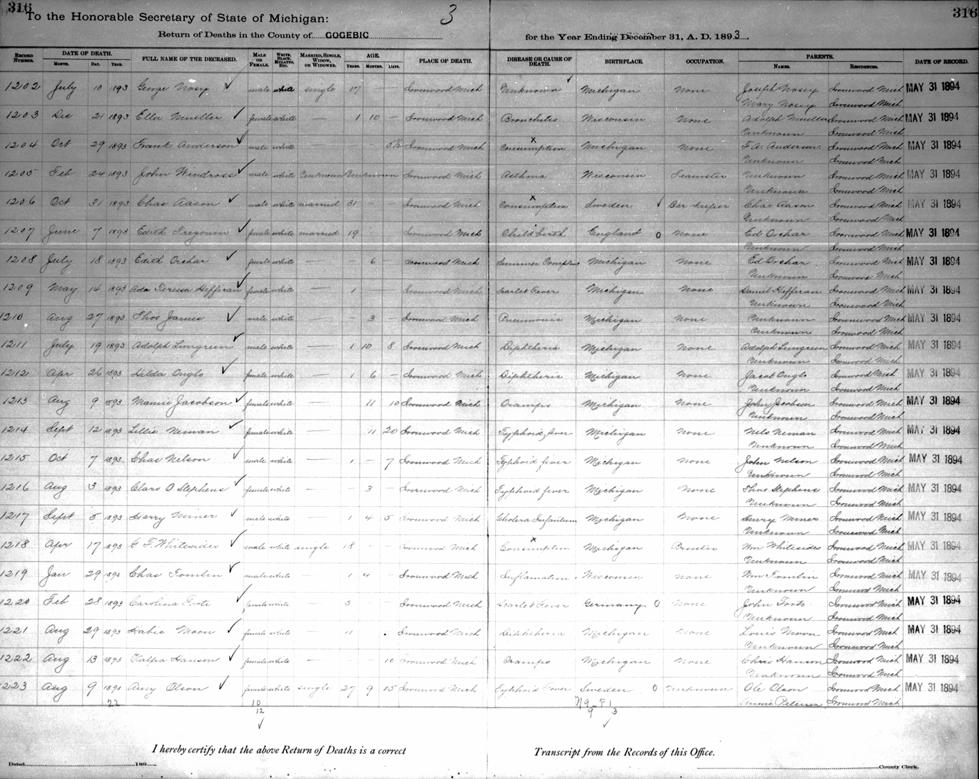 Adolph Lundgren died July 19, 1893, in Ironwood, Gogebic Co., MI, at age 1. Cause of death was Diptheria.