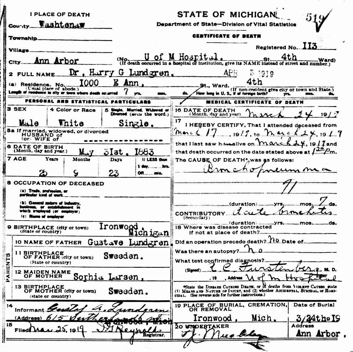 Harry Gustave Lundgren died March 24, 1919, at University of Michigan Hospital, Ann Arbor, Washentaw Co., MI, at age 25.