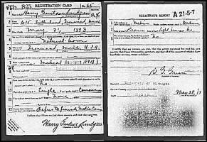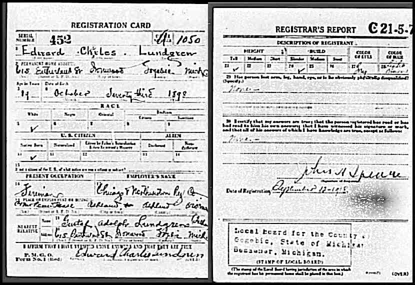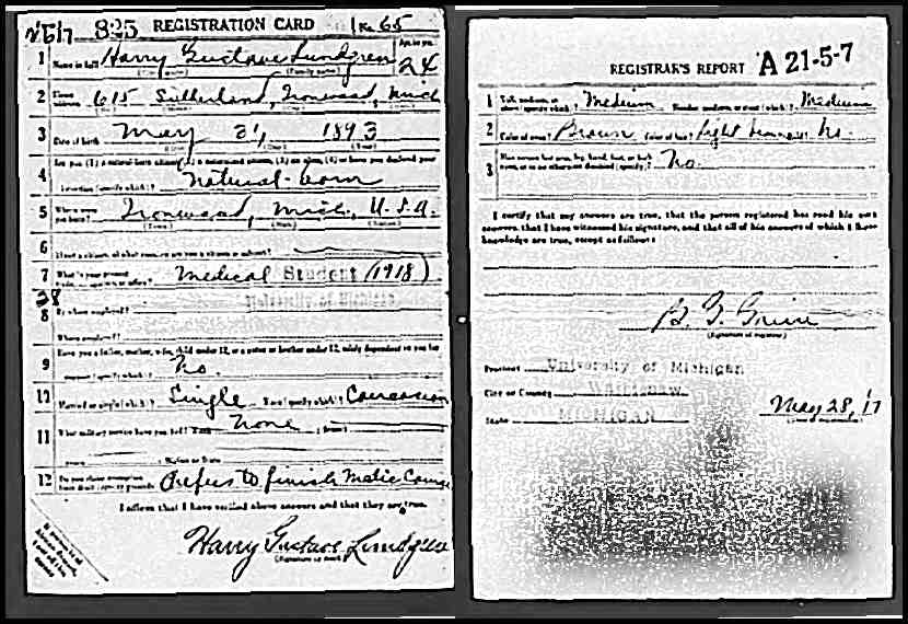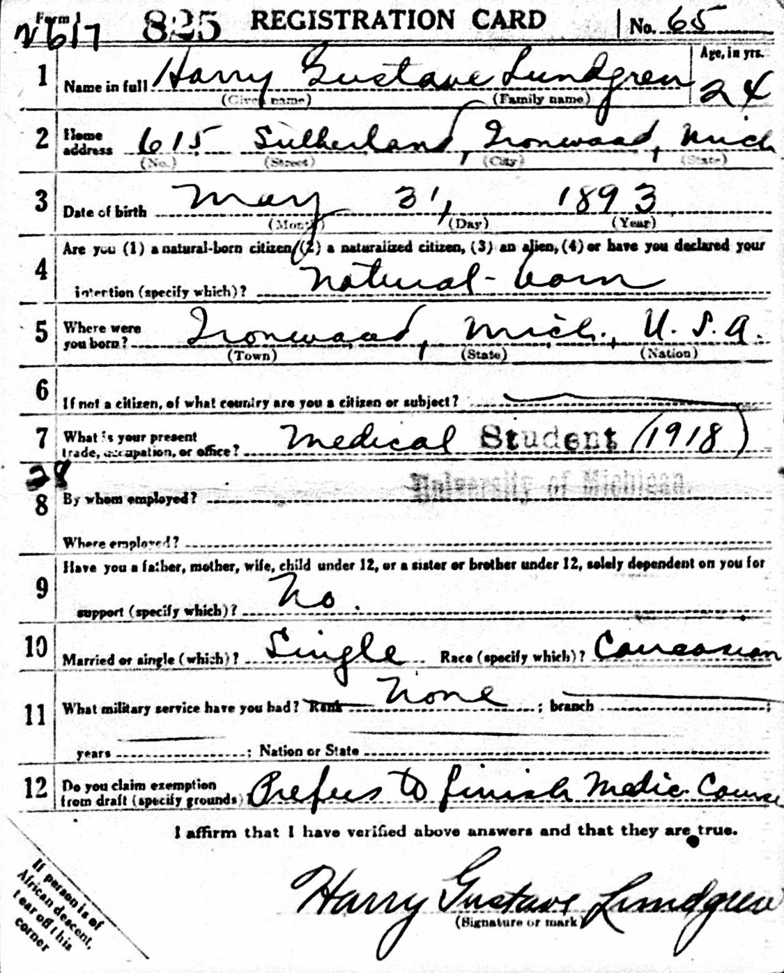 The WWI Draft Registration Report dated May 27, 1917, shows Harry Gustave Lundgren, born May 31, 1893, in Ironwood, Gogebic Co., MI, is an unmarried Medical Student, and is residing at 615 Sutherland Ironwood, Gogebic Co., MI