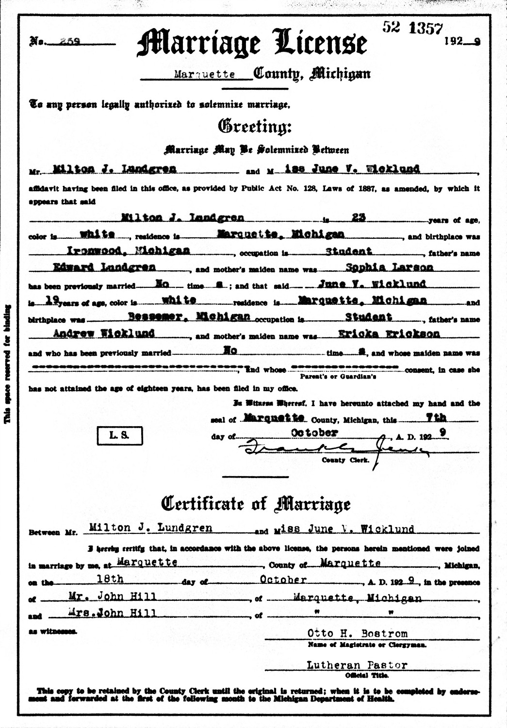 Milton J. Lundgren and June Victoria Wicklund were married October 18, 1929, in Marquette, Marquette Co., MI.