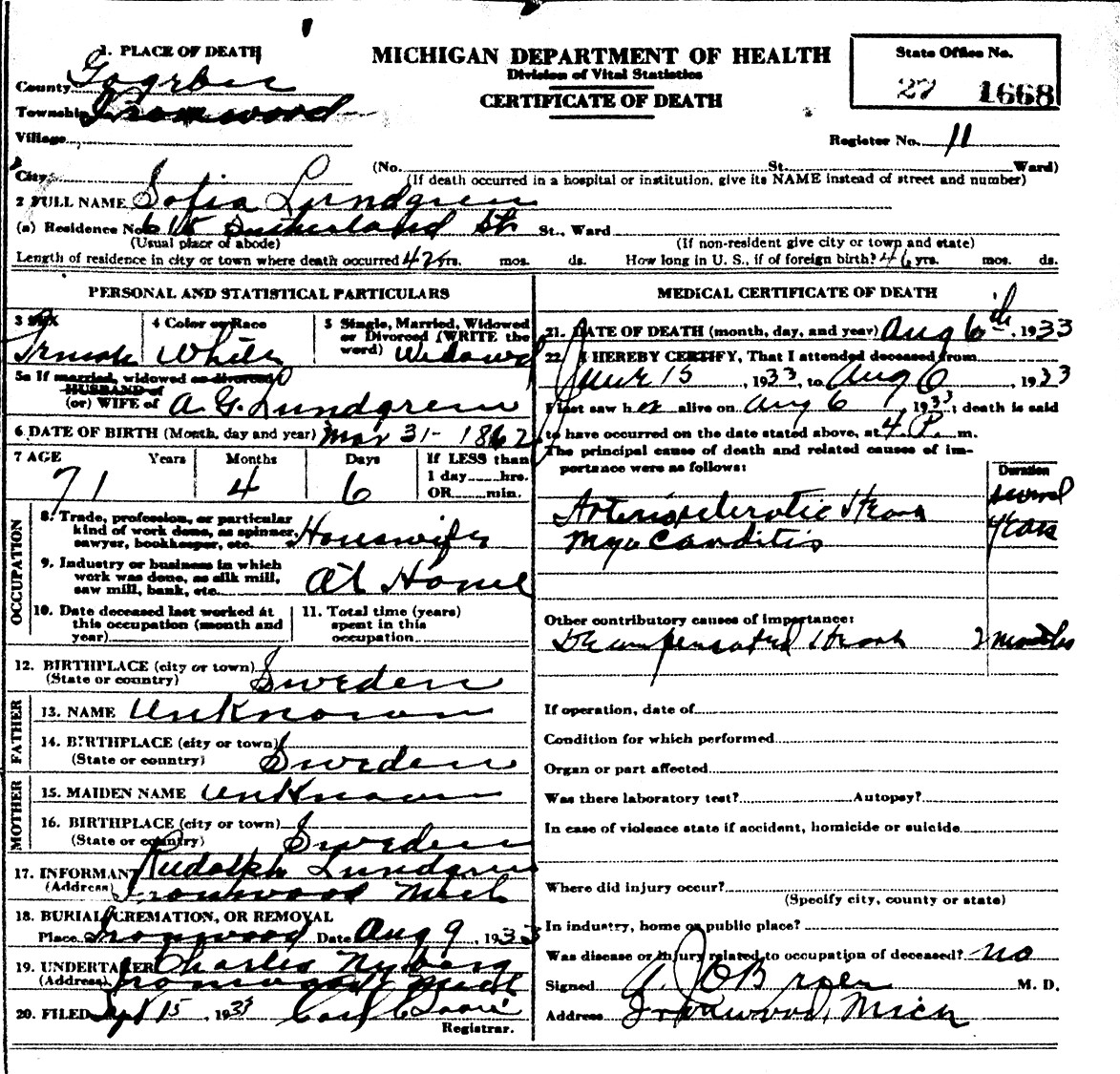 Sophia Louisa "Sophie" (Larson) Lundgren died August 6, 1933, in Ironwood Twp., Gogebic Co., MI, at age 71. Buried in Riverside Cemetery, Ironwood, Gogebic Co., MI.