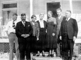Raymond Freeberg, Unknown, Evelyn Freeberg, Hilda Sophia Freeberg, Florence Freeberg, Clark Freeberg and Albert Freeberg. Raymond, Evelyn and Clark are the children of Albert and Florence. 402 Center Street, Miles City, MT.