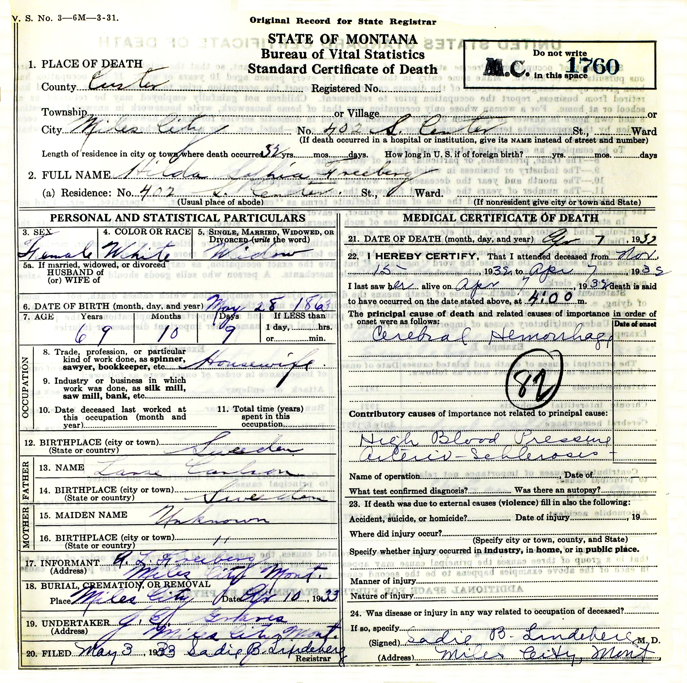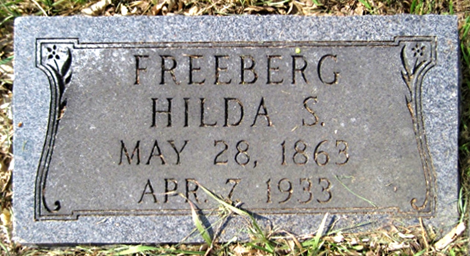 Hilda Sofia (Carlsdotter) Freeberg died April 7, 1933, in Miles City, Custer Co., MT, at age 69. Buried next to her daughter in Custer County Cemetery, Miles City, Custer Co., MT.