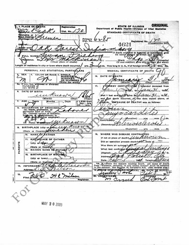 The Illinois Death Index shows Swan Frieberg died January 31, 1924, in Bremen Twp., Cook Co., IL. Death Certificate is # 0160267, filed February 5, 1924. Oak Forest is a community located in Bremen Twp. In 1971, Freeda (Larson) Lewis wrote in a family genealogy report dated 1971 that Uncle Swen Larson Freeberg "Became lost and confused on a visit to Waupaca. It is not known what happened on return as he was found in Chicago, where he passed away. Died in Old Folks in Chicago." Leigh Larson note: The term "Old Folks" probably refers to a slang term for a rest home or infirmary. The Oak Forest Infirmary appears to have been a rest home for the poor and mentally challenged. This would agree with Freeda's note that he became confused and lost in Chicago.