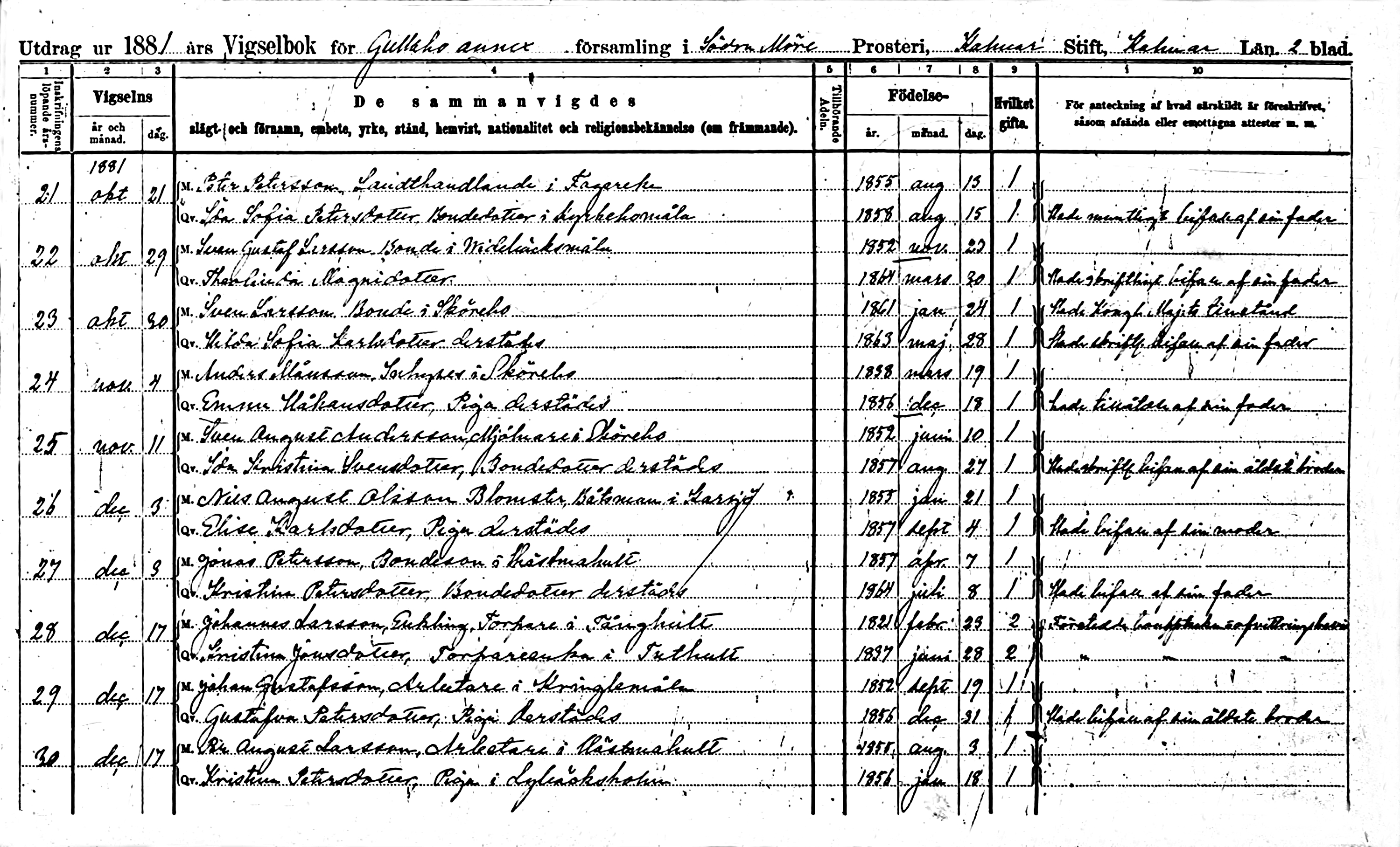 Sven Larsson and Hilda Sofia Carlsdotter were married October 30, 1881, in Gullabo, Kalmar Co., Sweden.