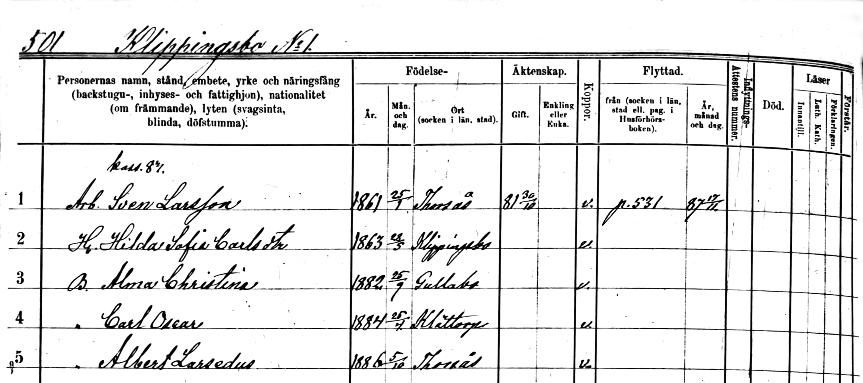 Sven Larsson and Hilda Sofia Carlsdotter moved into Vissefjärda , Kalmar Lan, Småland, Sweden, parish on August 18, 1884.