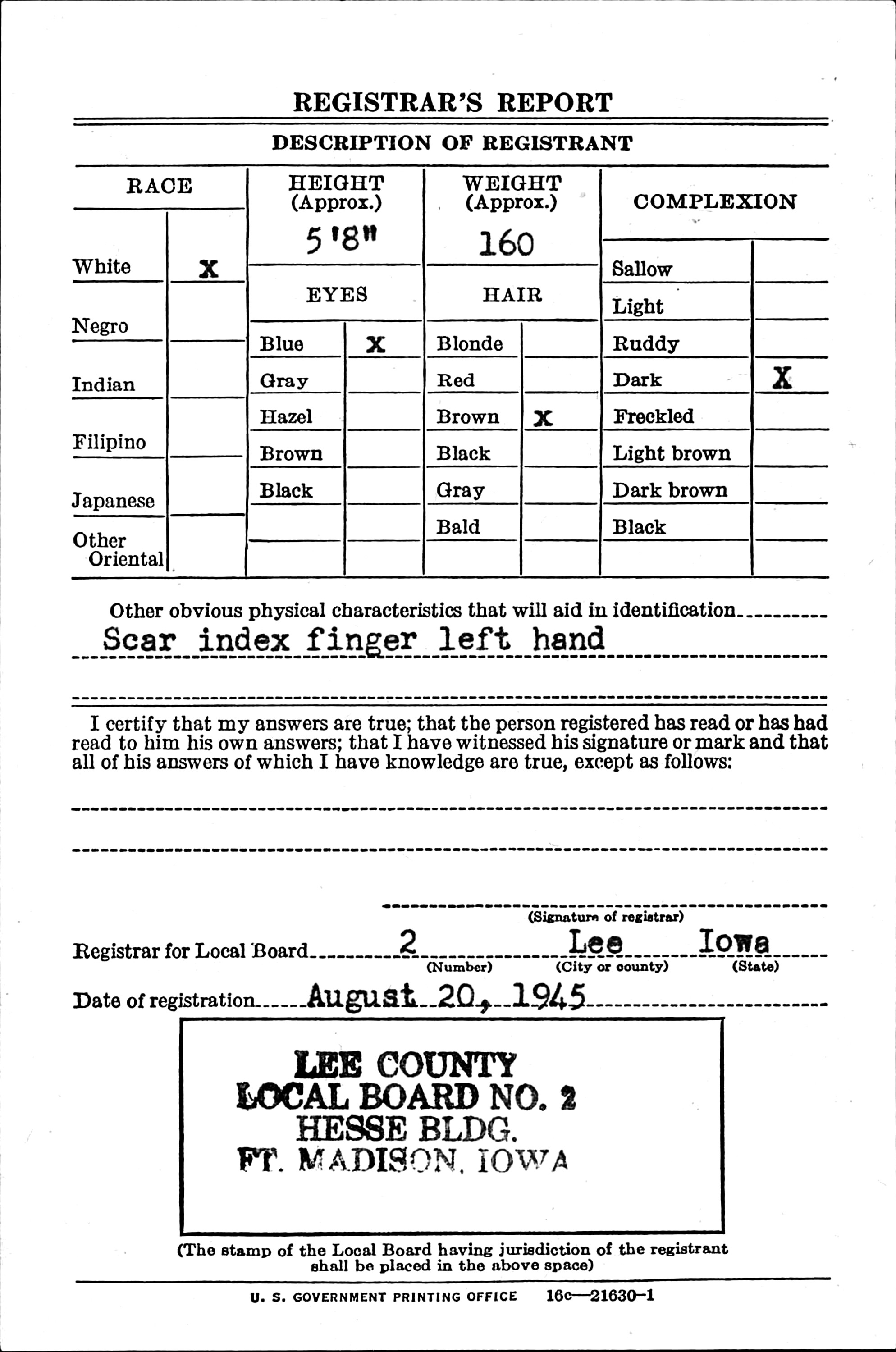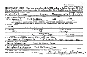 The WWII Draft Registration Report dated August 20, 1945, shows Cloud Hughes Thompson, Jr. (age 18) born Aug. 15, 1927, in Chicago., IL, is living at 1236 Avenue C, Fort Madison, Lee Co., IA. Mr. Cloud H. Thompson Sr. of the same address is the person who will always know his address.
