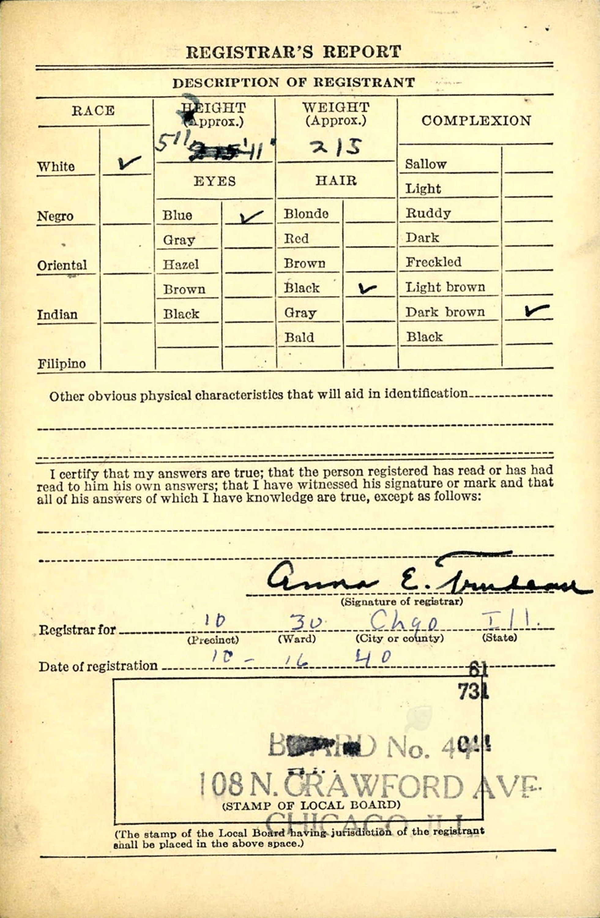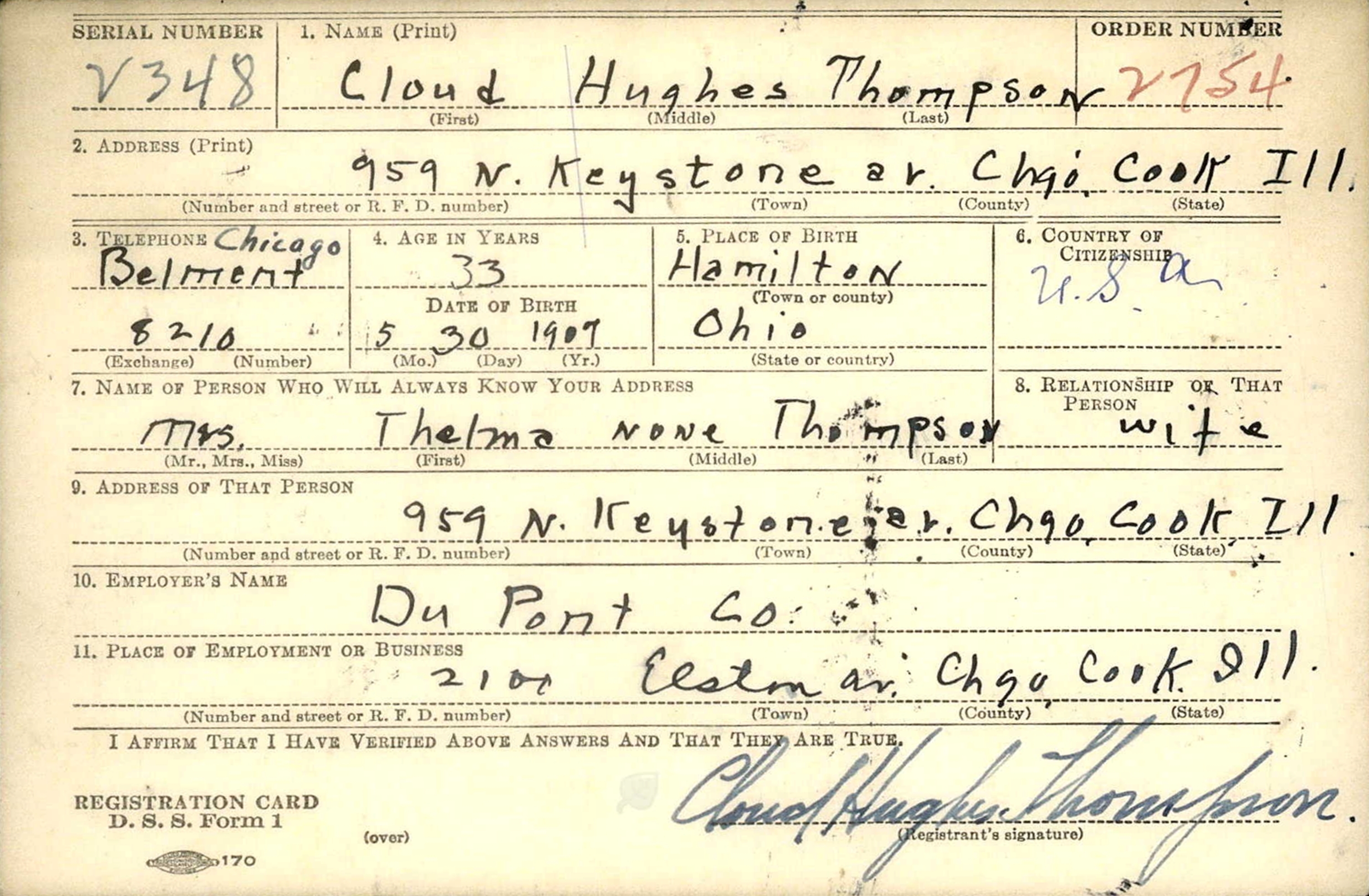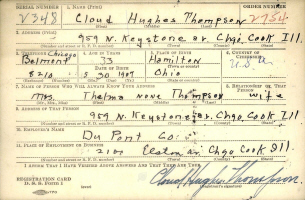 The WWII Draft Registration Report dated October 16, 1940, shows Cloud Hughes Thompson (age 33) born May 30, 1907, in Hamilton, OH, is employed by DuPont Co., 2100 Elston Avenue, Chicago, Cook Co., IL, and is living at 959 N. Keystone Avenue, Chicago, Cook Co., IL. Mrs. Thelma Thompson of the same address is the person who will always know his address.