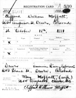The WWI Draft Registration Report dated September 12, 1918, shows Clifford William Moffatt (age 36) born October 18, 1881, is a married Driver for American Railway Express Co., and is living at 2654 Arapahoe Street, Denver, Denver Co., CO. His nearest relative is his wife, May.