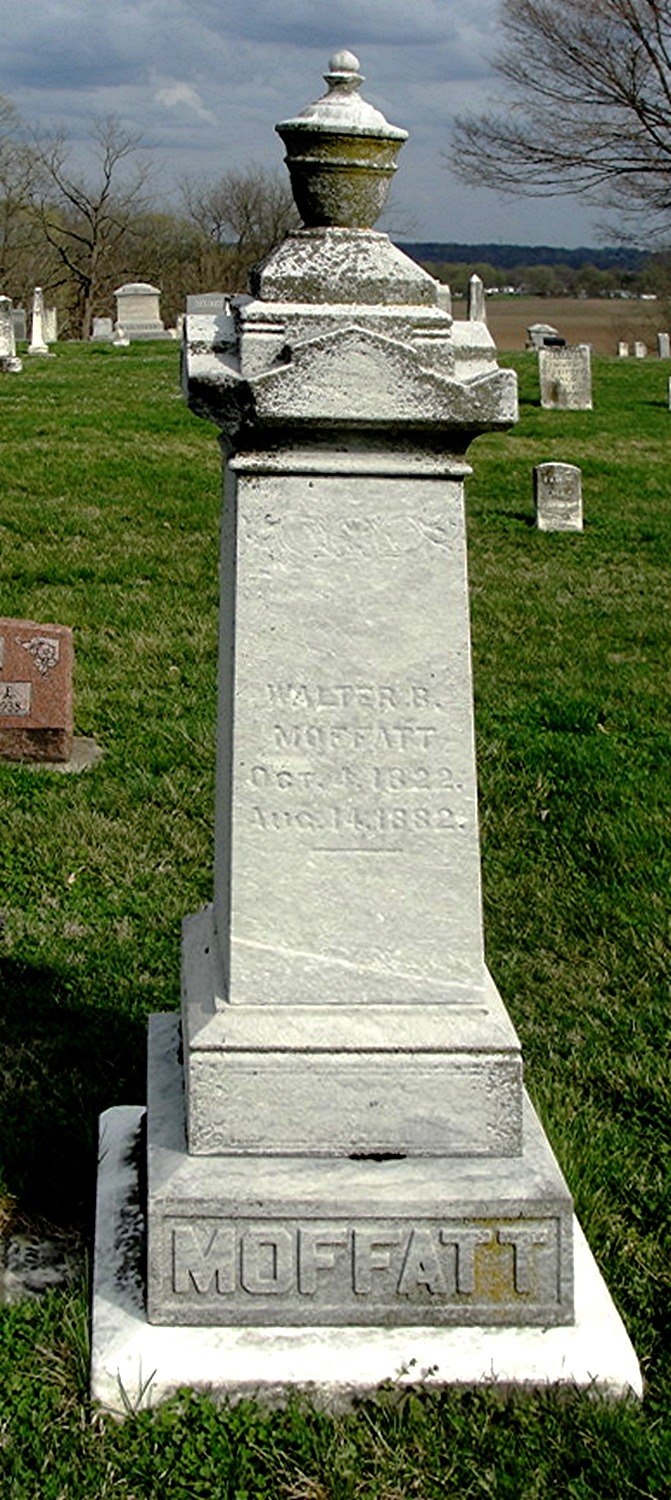Walter Brown Moffatt died August 14, 1882, in Perrysville, Highland Twp., Vermillion Co., IN, at age 59. Buried in Hicks Cemetery, Perrysville, Highland Twp., Vermillion Co., IN.