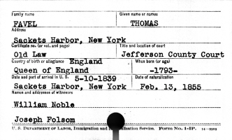Thomas Feavel Jr. arrived in the United States on May 10, 1839, at Sackets Harbor, Town of Hounsfield, Jefferson Co., NY.