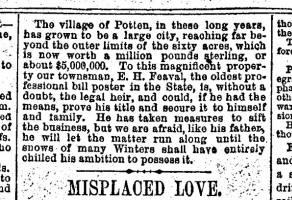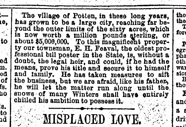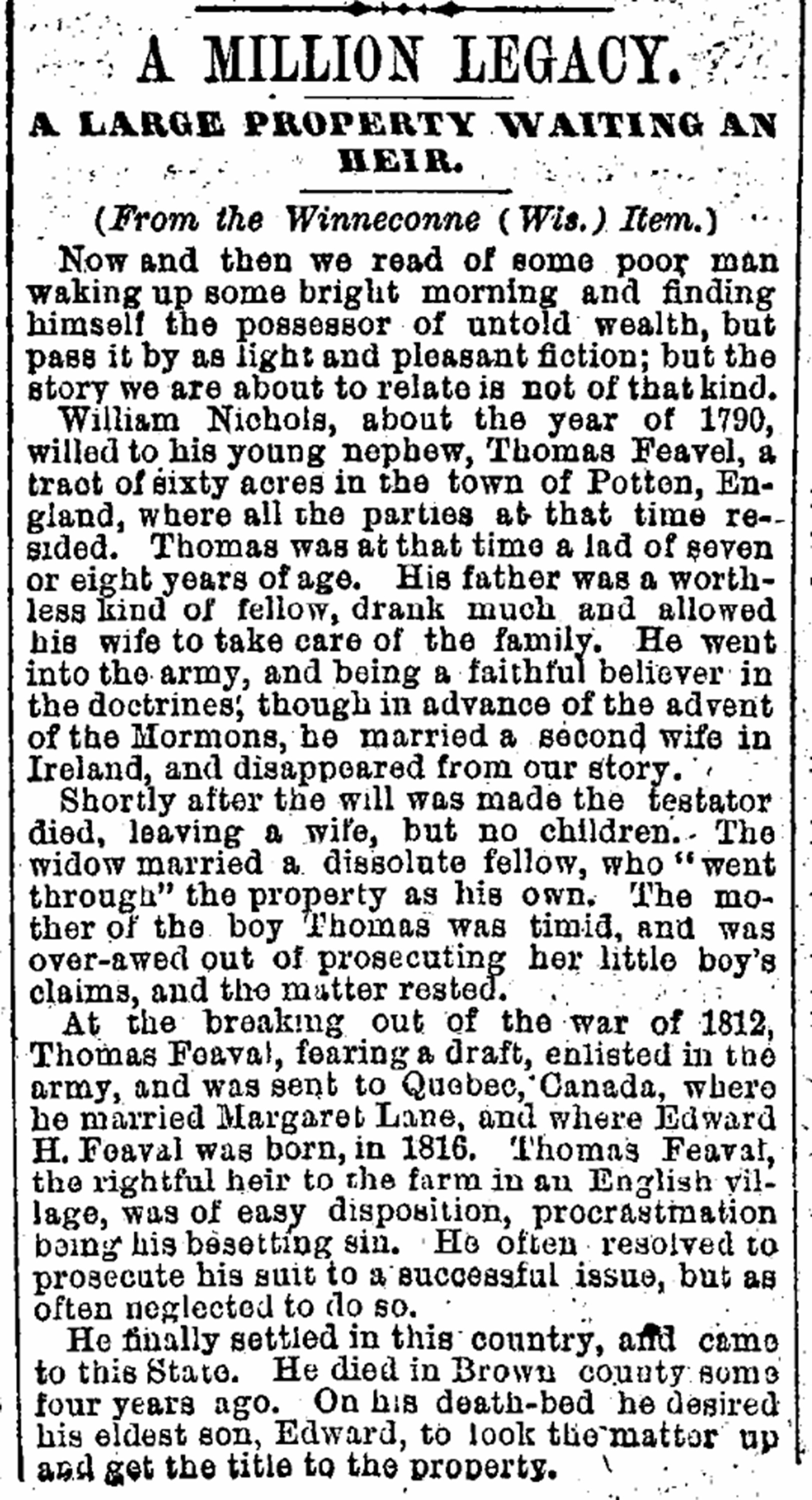 Now and then we read of some poor man waking up some bright morning and finding himself the possessor of untold wealth, but pass it by as light and pleasant fiction; but the story we are about to relate is not of that kind. William Nichols, about the year 1790, willed to his young nephew, Thomas Feavel, a tract of sixty acres in the town of Potten, England, where all the parties at that time resided. Thomas was at that time a lad of seven or eight years of age. His father was a worthless kind of fellow, drank much and allowed his wife to take care of the family. He went into the army, and being a faithful believer in the doctrines; though in advance of the advent of the Mormons, he married a second wife in Ireland, and disappeared from our story. Shortly after the will was made the testator died, leaving a wife but no children. The widow married a dissolute fellow, who "went through" the property as as his own. The mother of the boy Thomas was timid, and was over-awed out of prosecuting her little boy's claims, and the matter rested. At the breaking out of the war of 1812, Thomas Feavel, fearing a draft, enlisted in the army, and was sent to Quebec, Canada, where he married Margaret Lane, and where Edward H. Feavel was born in 1816. Thomas Feavel, the rightful heir to the farm in an English village, was of easy disposition, procrastination being his besetting sin. He often resolved to prosecute his suit to a successful issue, but as often neglected to do so. He finally settled in this country, and came to this state. He died in Brown county some four years ago. On his death-bed he desired his eldest son, Edward, to look the matter up and get title to the property. The village of Potten, in these long years, has grown to be a large city, reaching far beyond the outer limits of the sixty acres, which is now worth a million pounds sterling, or about $5,000.000. To this magnificent property our townsman, E. H. Feavel, the oldest professional bill poster in the State, is, without a doubt, the legal heir, and could, if he had the means, prove his title and secure it to himself and family. He has taken measures to sift the business, but we are afraid, like his father, he will let the matter run along until the snows of many Winters shall have entirely chilled his ambition to possess it.