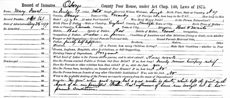 Mary Feavel, age 17, daughter of Thomas Feavel, III, on August 28, 1879, is admitted to the Poorhouse in Oswego, NY. She is pregnant, and claims she lost a good mother while quite young, and left her in the hands of an unprincipled father. Bad influences at home brought her to her present condition. Mary M. (Feavel) Kilmer died May 14, 1917, in Minetto, Oswego Co., NY, at age 54.