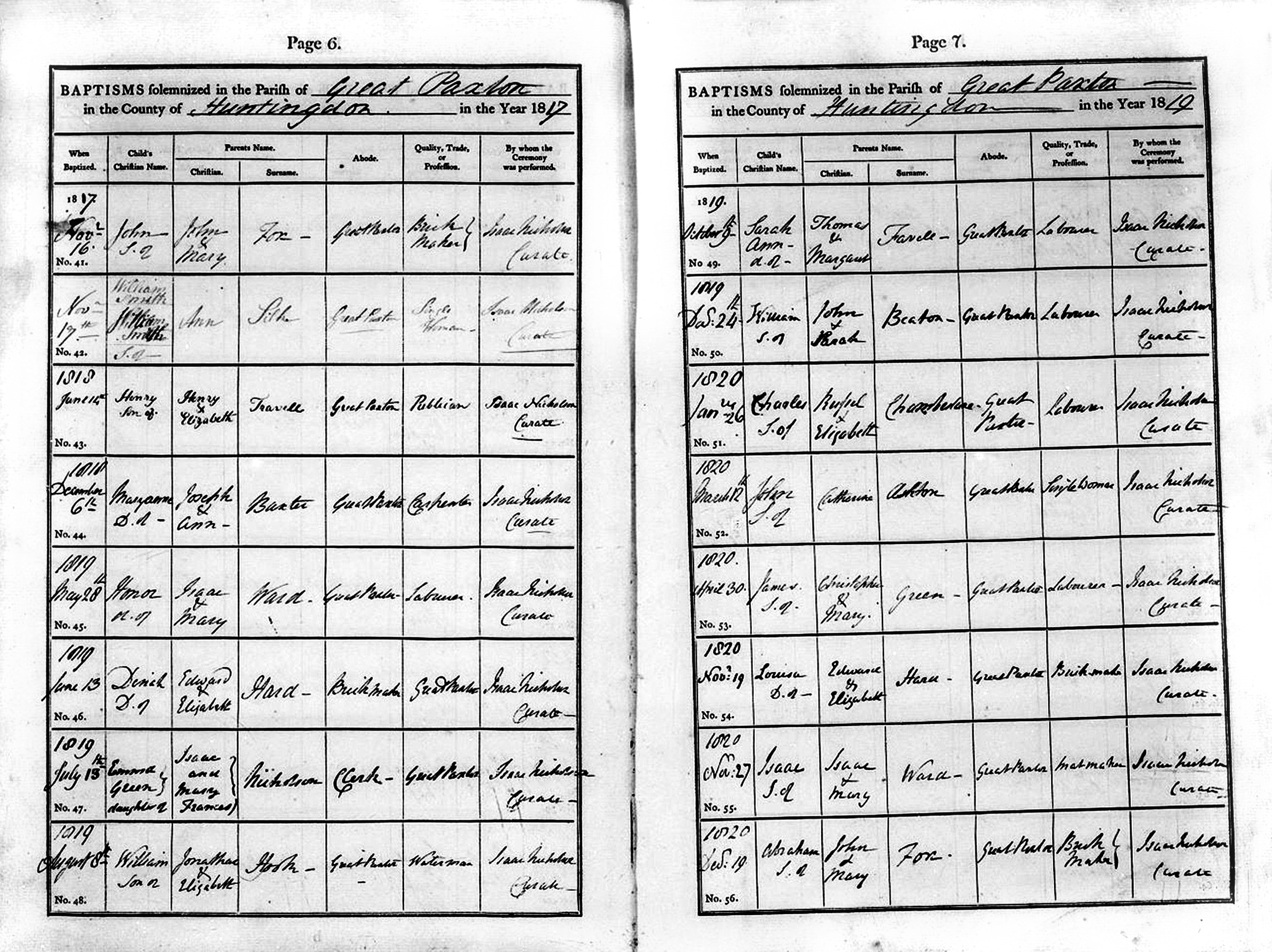 - Sarah Ann Feavel : Born September 18, 1819, in Little Paxton, Huntingdon Co., England ; was Christened October 9, 1819, at Great Paxton, Huntingdonshire, England; Died Unknown.