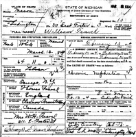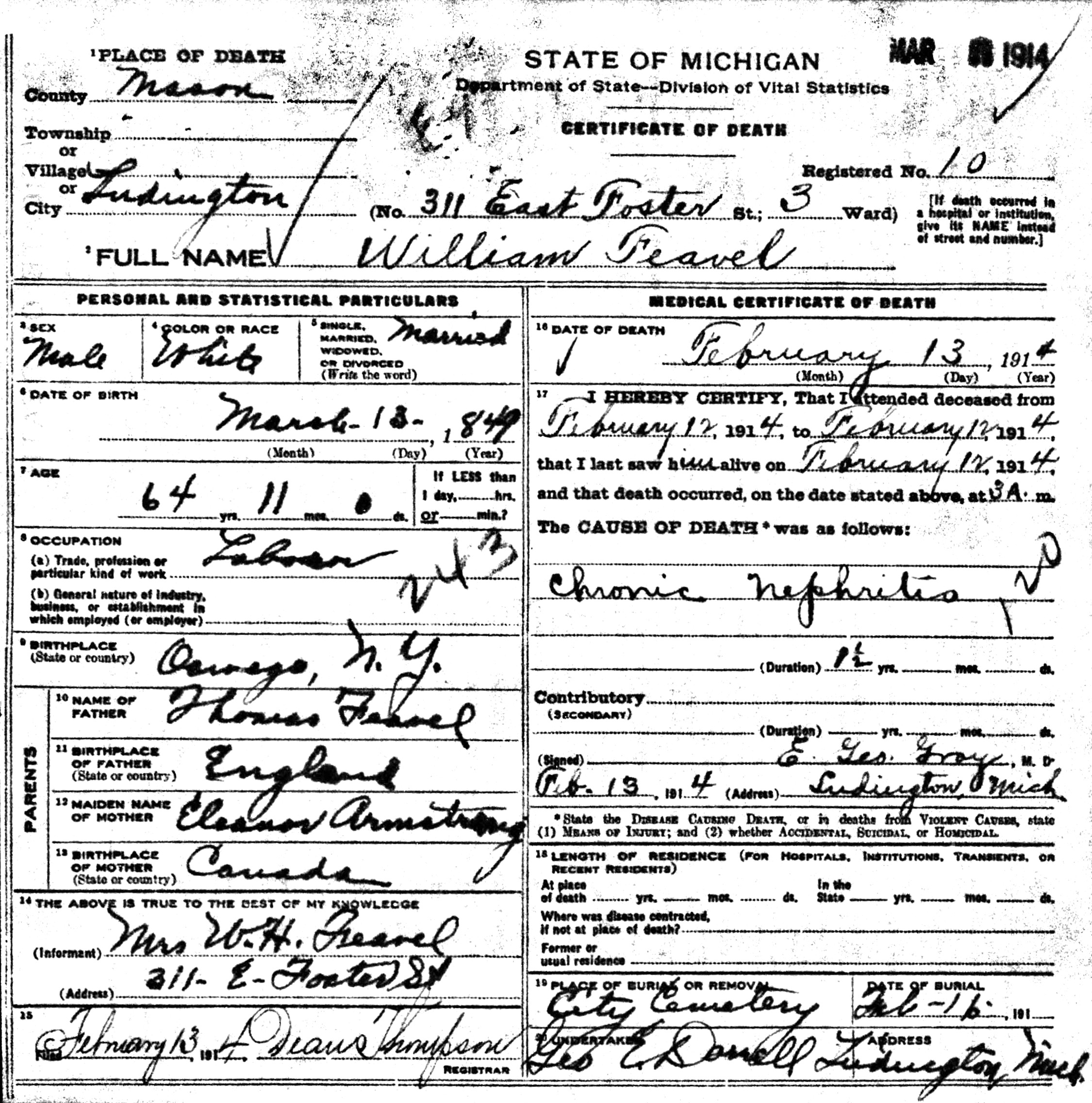 William Henry Page/Feavel d ied February 13, 1914, in Ludington, Mason Co., MI, at age 64. Buried in Lakeview Cemetery, Ludington, Mason Co., MI.