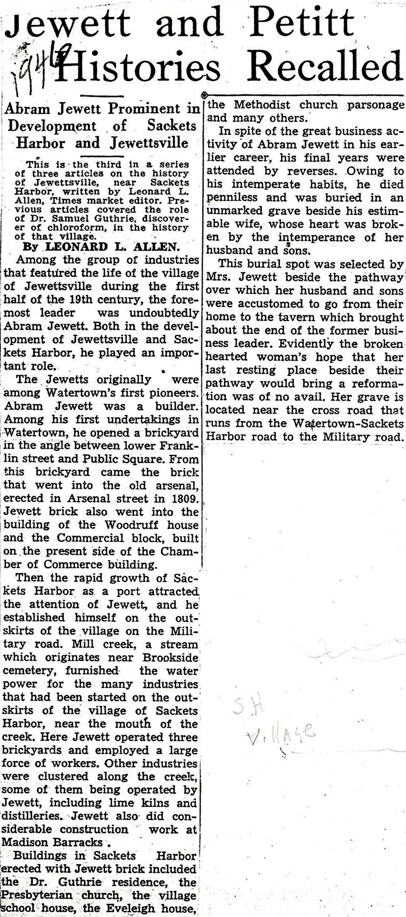 A bram Jewett Prominent in Development of Sackets Harbor and Jewettsville.