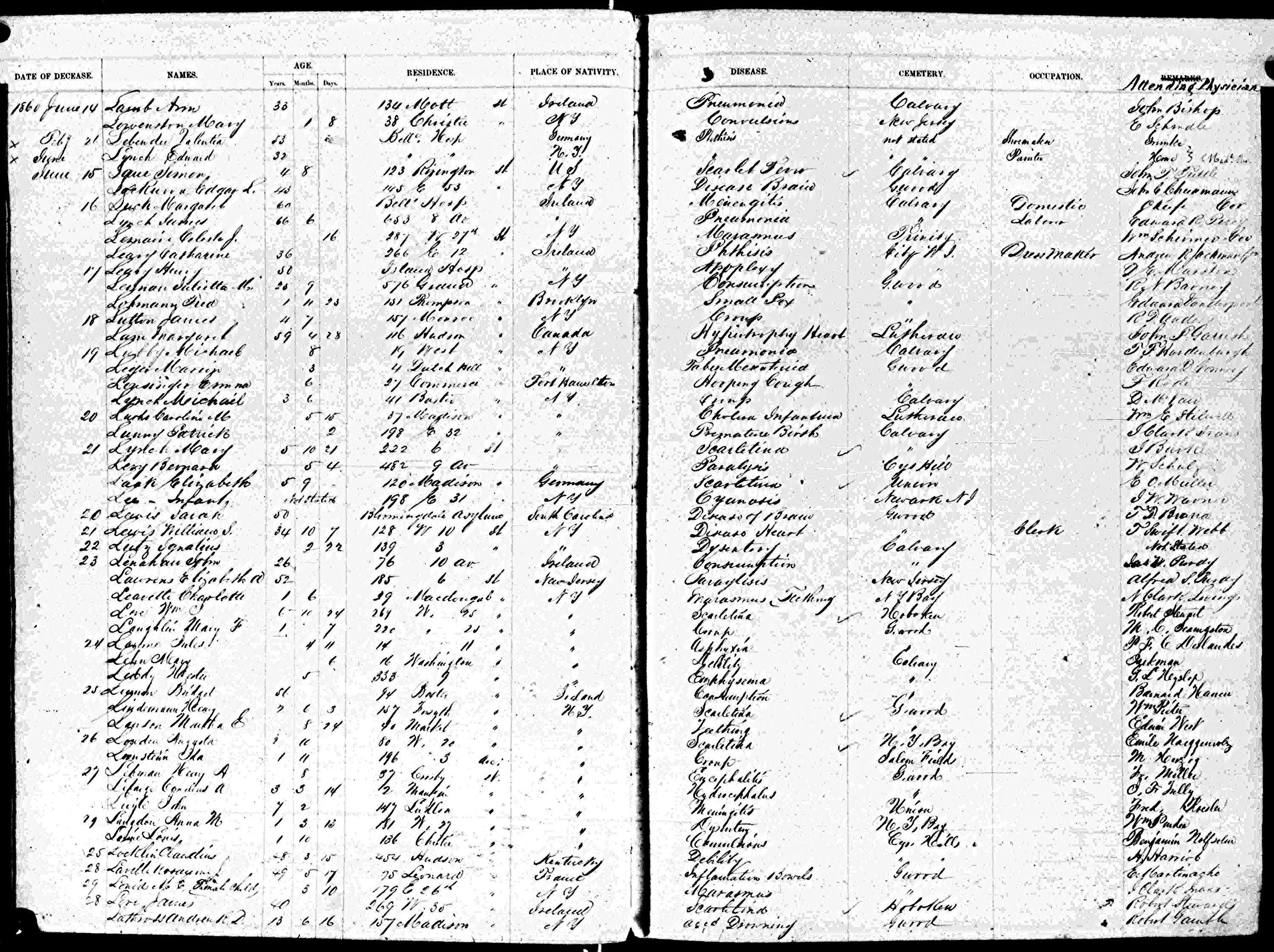 Margaret Ann (Lane) Feavel died June 18, 1860, in Manhattan, NY, at age 69 Years 4 Months and 24 Days. Buried in Lutheran Cemetery.