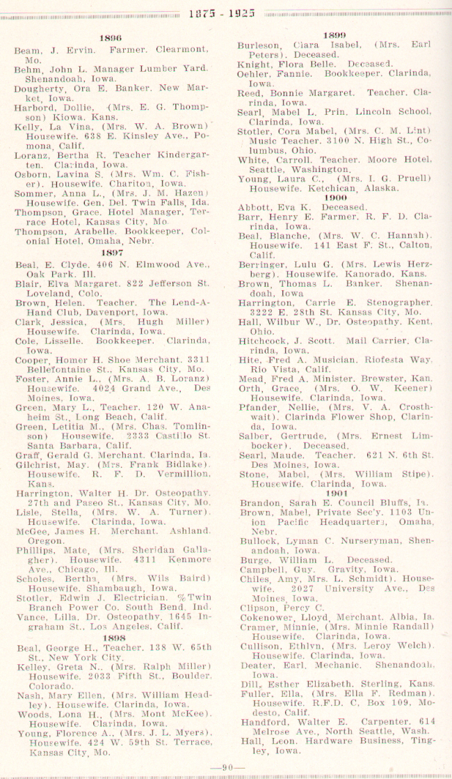The 1920 U. S. Census taken on January 9, 1920, shows Thomas G. Searles (age 66) born in Canada to English and Irish-born parents is a Produce Dealer owning his own home and is living in the City of Clarinda, Nodaway Twp., Page Co., IA. Living with him is his wife, Alice Searles (age 65) born in Indiana to North Carolina and Tennessee-born parents. Also living there is his unmarried daughter: Mabel Searles (age 40) born in Texas to Canadian and Indiana-born parents, who is a City School Teacher.