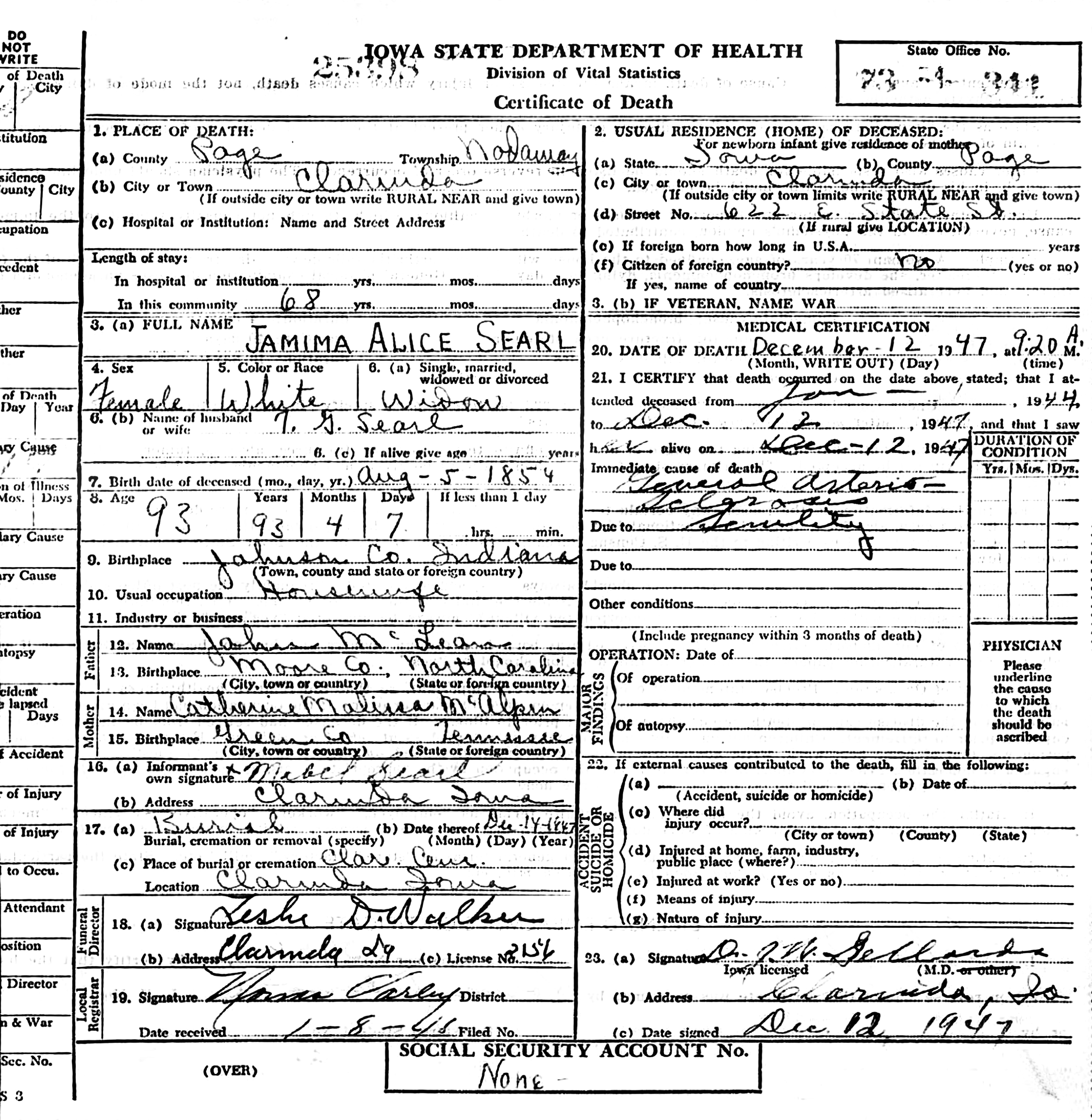 Jamima Alice "Addie" (McLain) Searl died December 12, 1947, in Clarinda, Page Co., IA, at age 93. Buried in Clarinda Cemetery, Clarinda, Nodaway Twp., Page Co., IA.