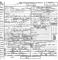 The 1940 U. S. Census taken on April 18, 1940, shows Alice Searls (age 85) born in Indiana, and 5 years ago was living in the Same House, and with 8 years of School, is a widowed Head of Household who owns her home worth $2,700 and is living at 622 East State Street, 1st Ward, City of Clarinda, Nodaway Twp., Page Co., IA. Living with her are: her unmarried daughter, Mabel Searles (age 61) born in Texas, and 5 years ago was living in the Same House, and with 6 years of College, a Superintendent of County Schools; her unmarried daughter, Maude Searles (age 59) born in Texas, and 5 years ago was living in Des Moines, Polk Co., IA, and with 8 years of College, a Superintendent of County Schools; and a widowed housekeeper, Stella Wansley (age 60) born in Iowa, and 5 years ago was living in Des Moines, Polk Co., IA, and with 8 years of School, a House Keeper for a Private Family.