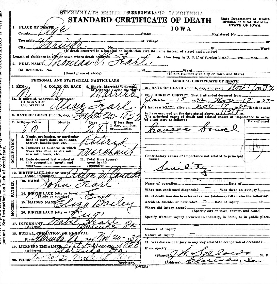 Thomas Greenfield Searl died November 17, 1932, in Clarinda, Nodaway Twp., Page Co., IA, at age 80. Buried in Clarinda Cemetery, Clarinda, Nodaway Twp., Page Co., IA.